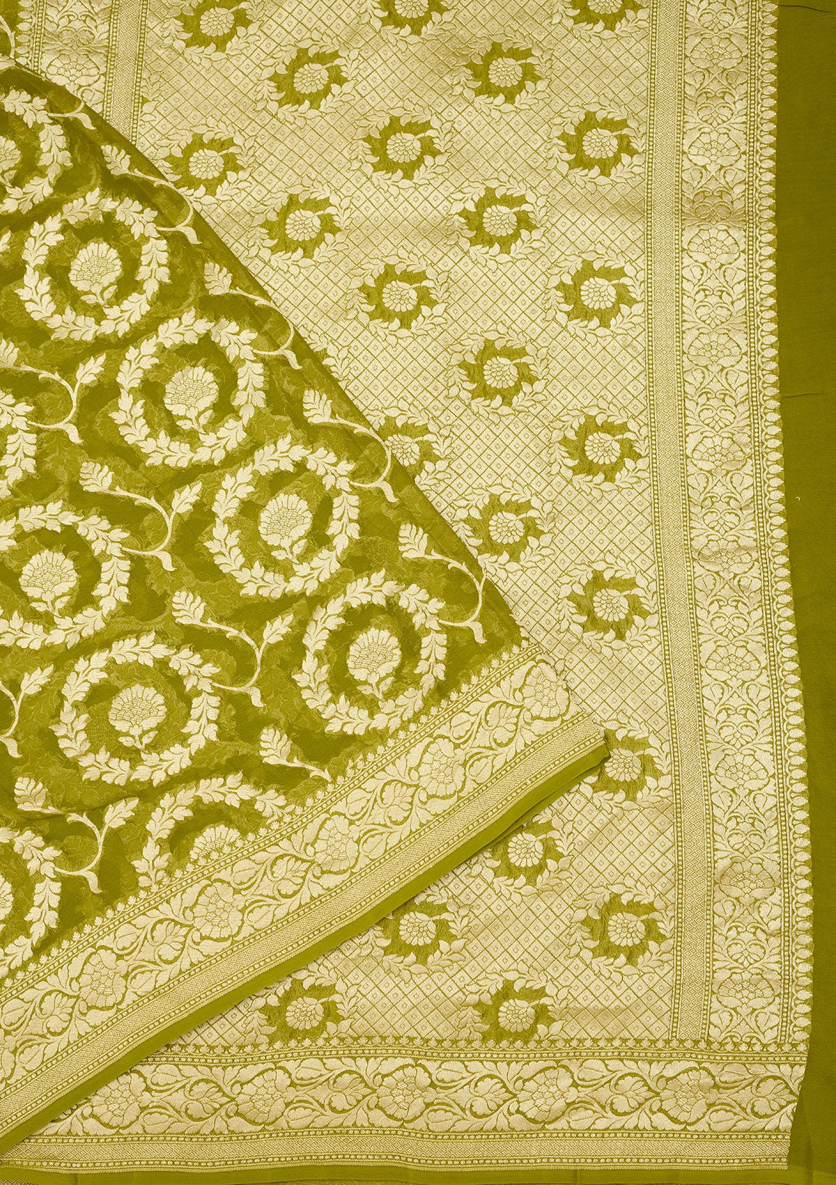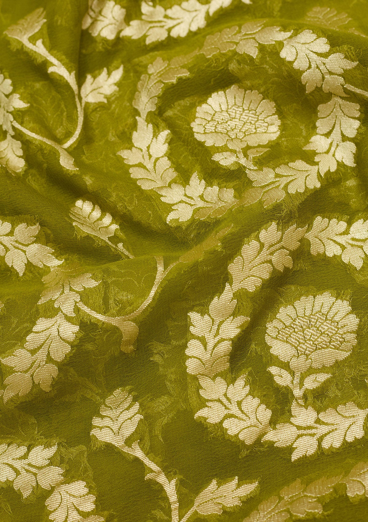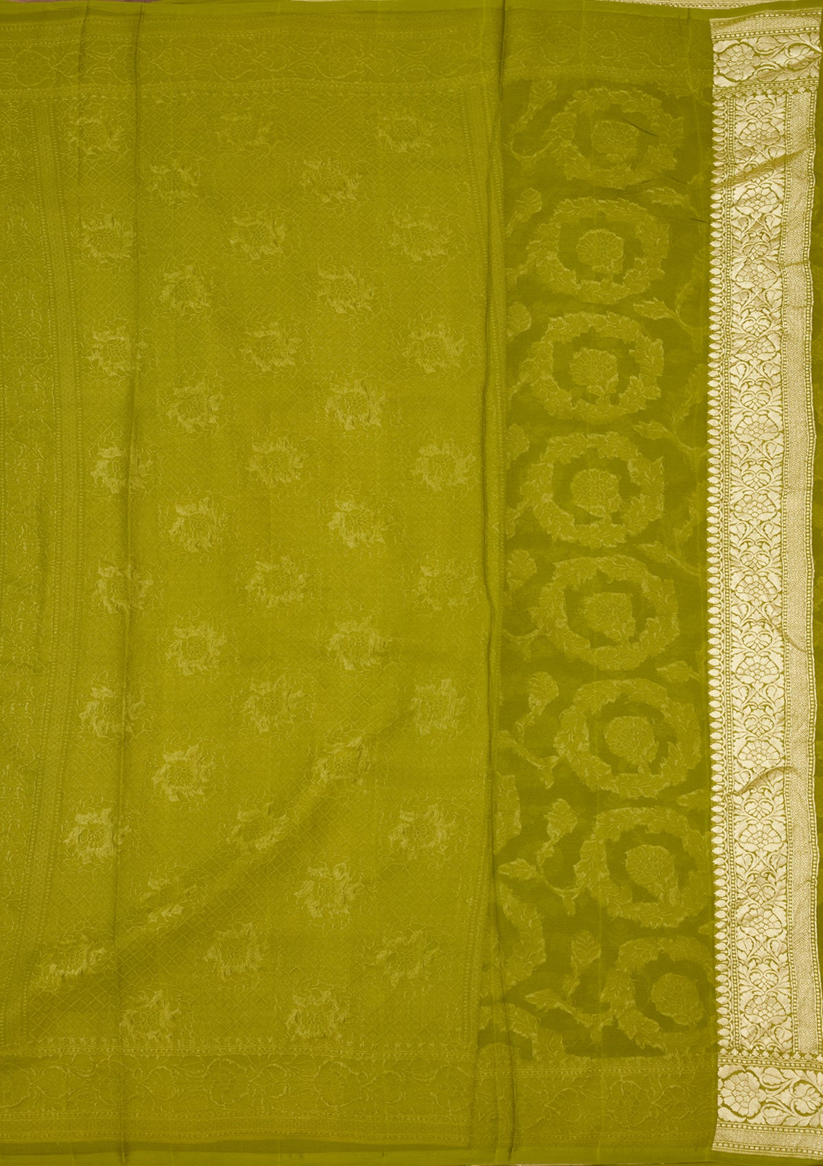 Mehendi Silk_Saree in Georgette fabric. The Silk_Saree is elevated with Zariwork embroidery. It comes with an Unstitched blouse. Comes with the Koskii promise of premium quality.