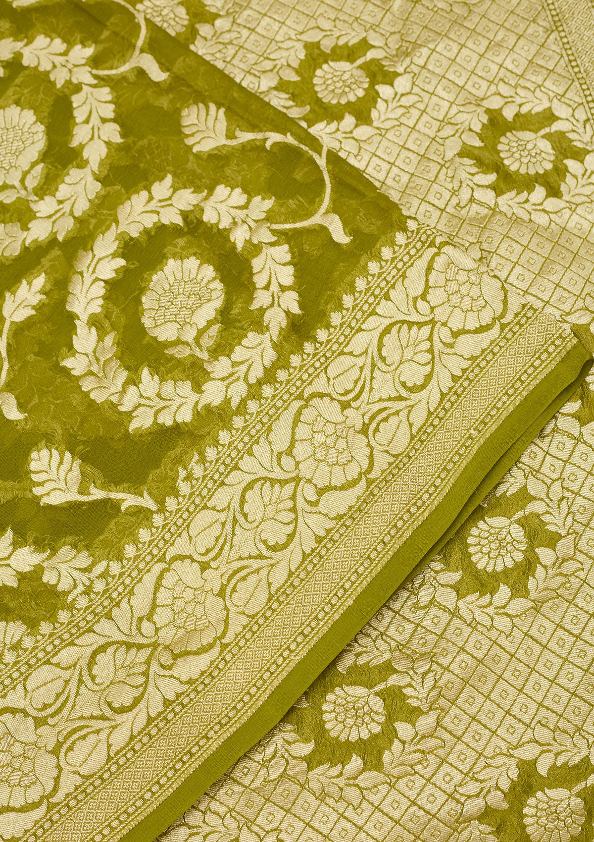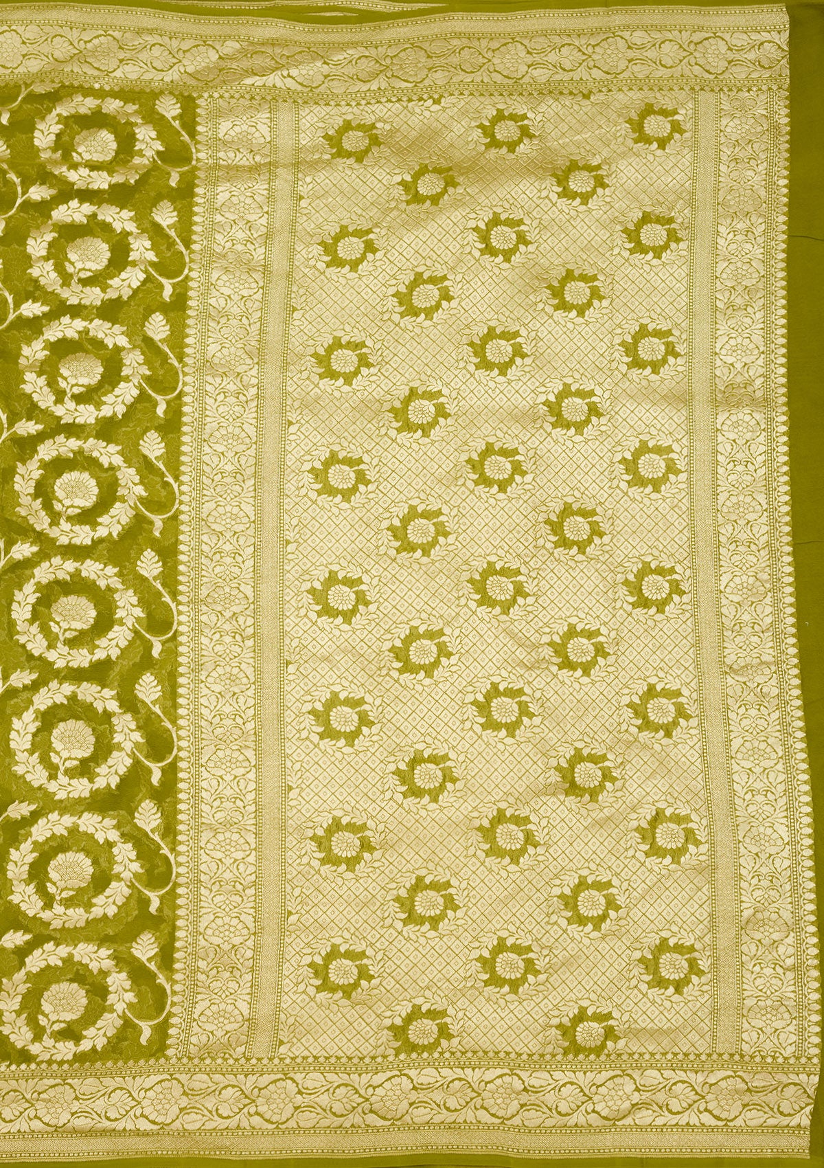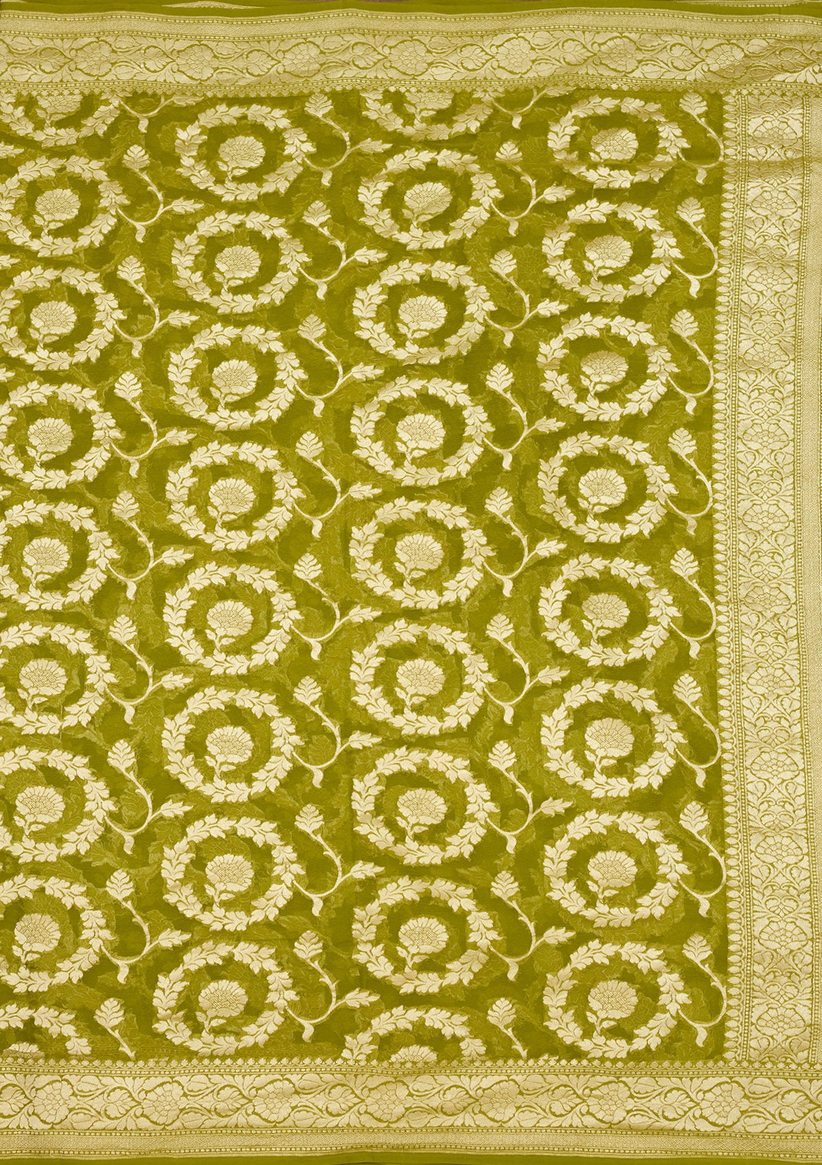 Mehendi Silk_Saree in Georgette fabric. The Silk_Saree is elevated with Zariwork embroidery. It comes with an Unstitched blouse. Comes with the Koskii promise of premium quality.
