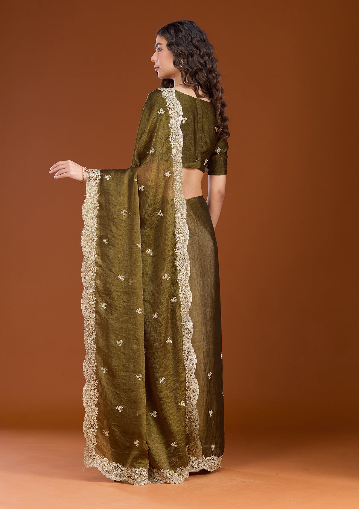 Mehendi Saree in Tissue fabric. The Saree is elevated with Zariwork (Gold) embroidery. It comes with an Unstitched blouse. Comes with the Koskii promise of premium quality.