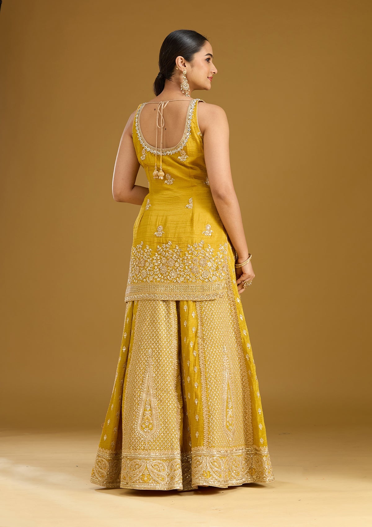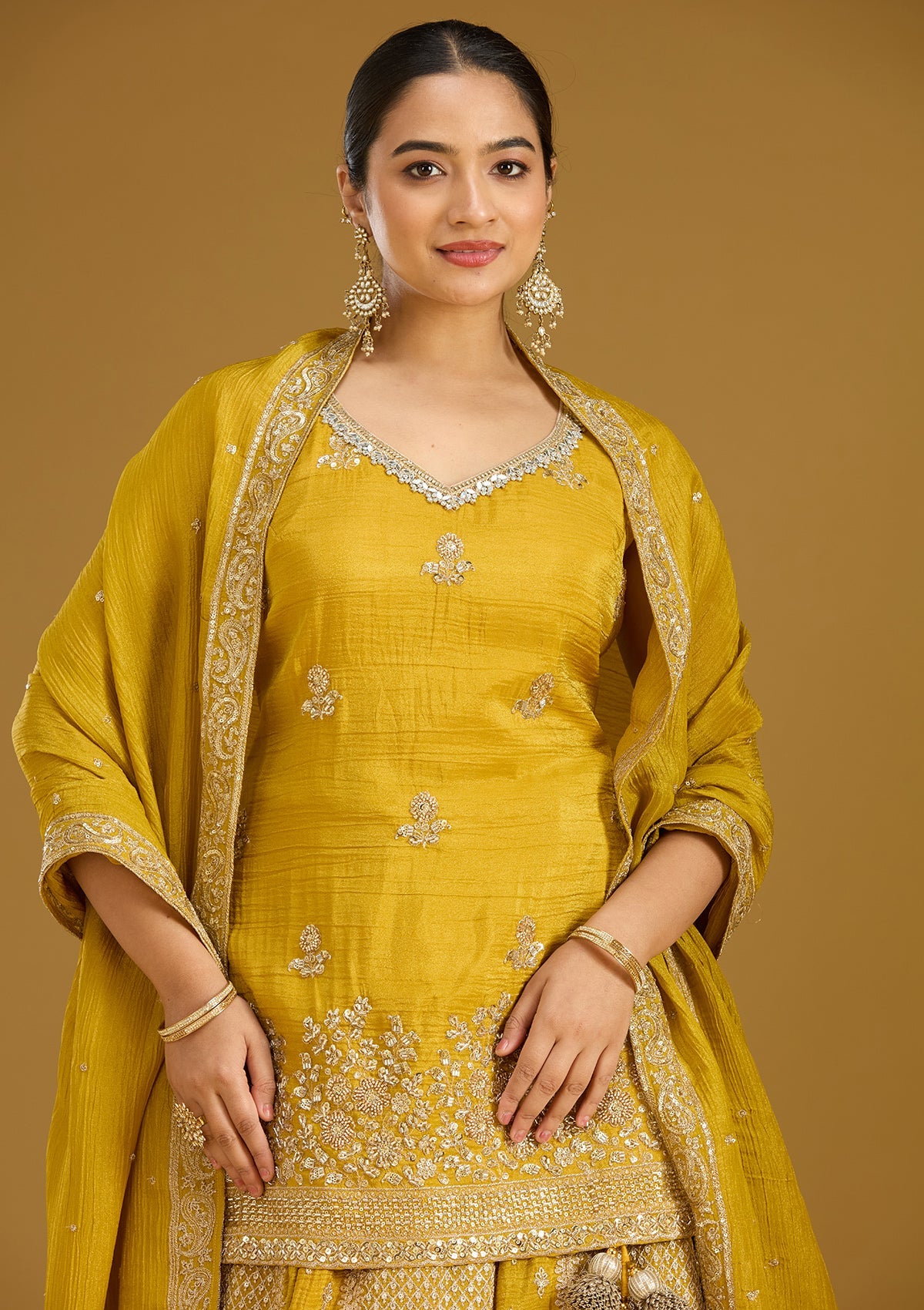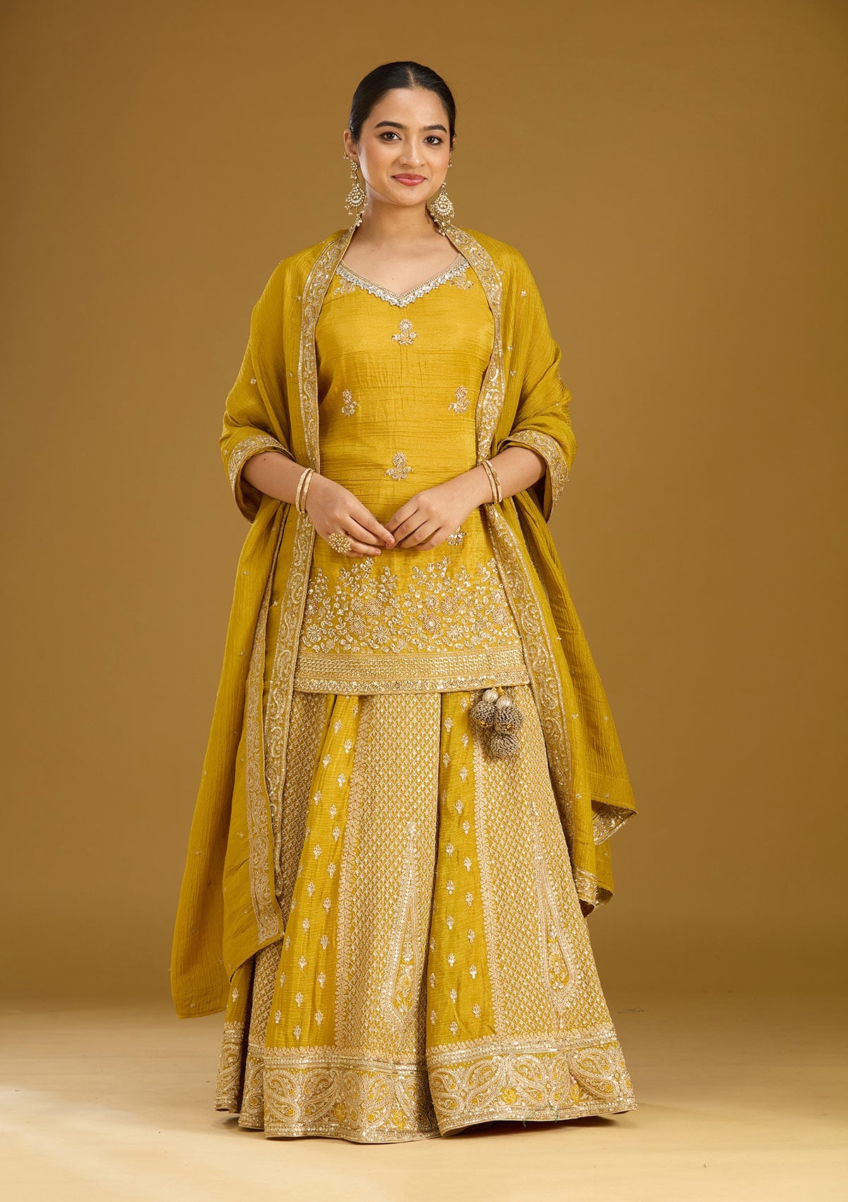Mustard Salwar_RM in Tissue fabric. The Salwar_RM is embellished with Cutdana embroidery. Accompanied with a bottom and dupatta. Comes with the Koskii promise of premium quality.