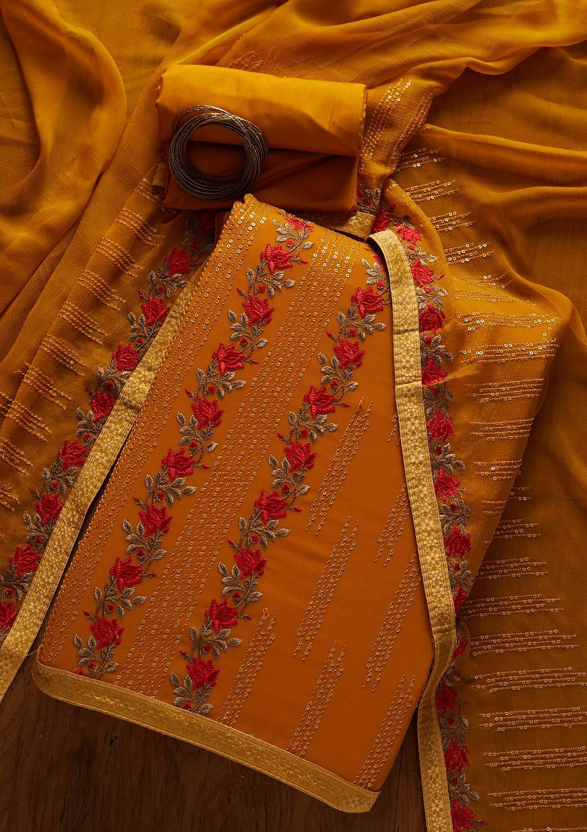 Mustard Salwar Suit In Georgette Fabric. The Salwar Suit Is Embellished With Sequins Embroidery. Accompanied with an unstitched bottom and dupatta. Comes With The Koskii Promise Of Premium Quality.