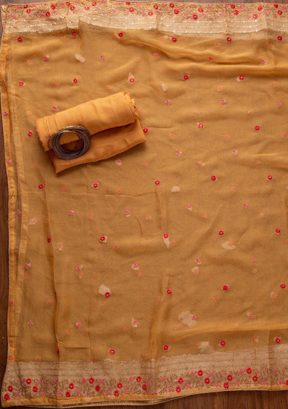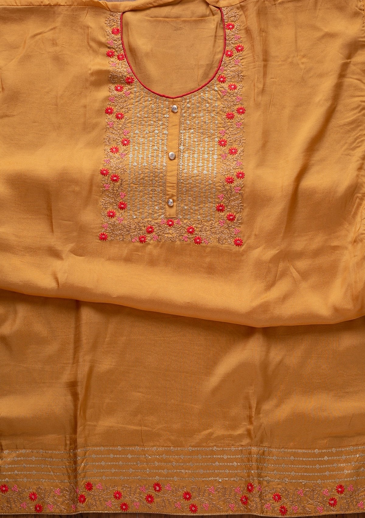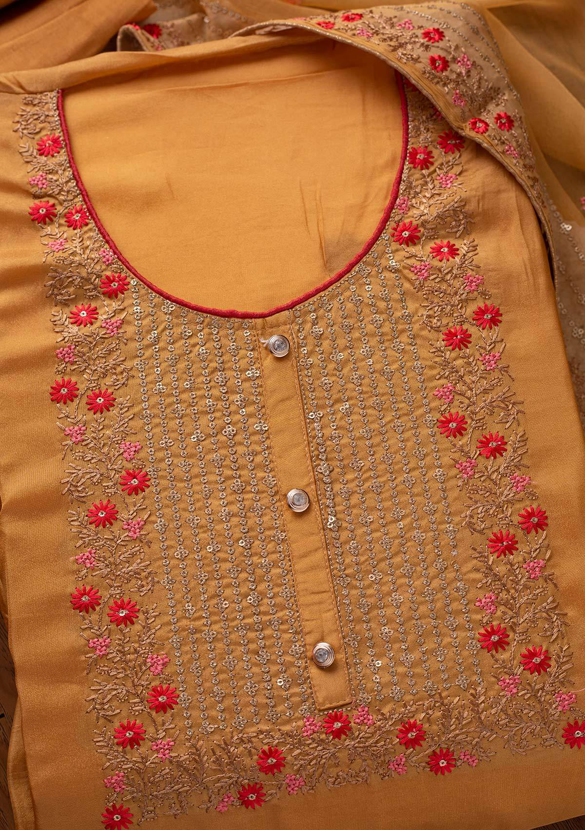 Mustard Salwar Suit In Semi Crepe Fabric. The Salwar Suit Is Embellished With Sequins Embroidery. Accompanied with an unstitched bottom and dupatta. Comes With The Koskii Promise Of Premium Quality.