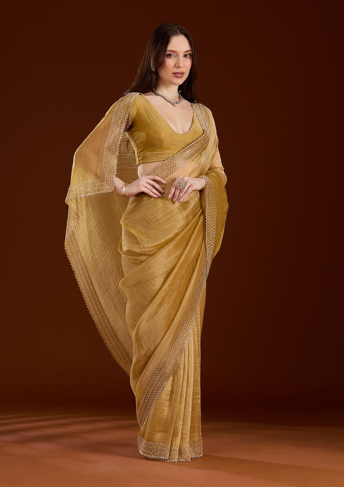 Mustard Saree in Organza fabric. The Saree is elevated with Stonework (Gold) embroidery. It comes with an Unstitched blouse. Comes with the Koskii promise of premium quality.