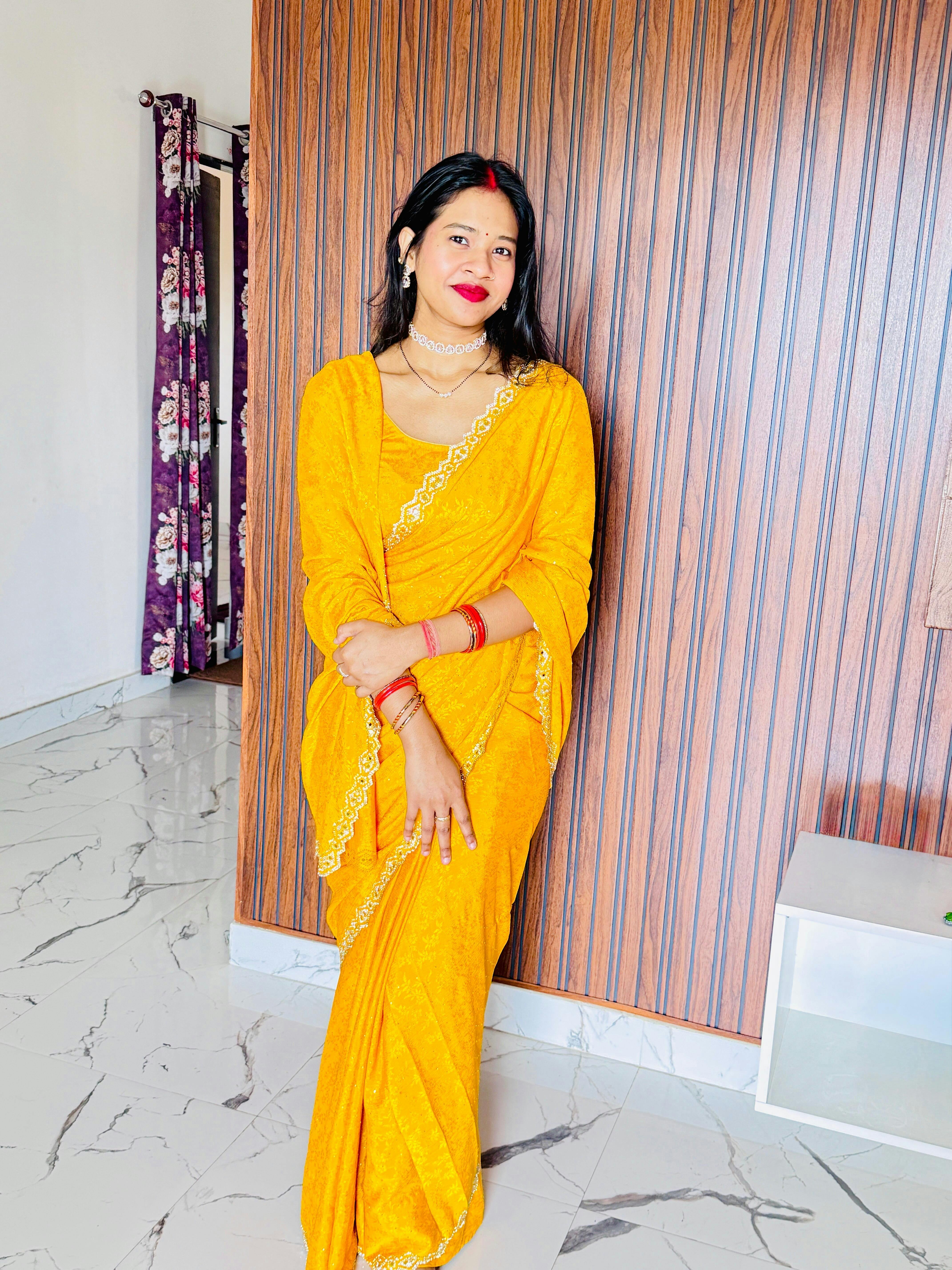 Mustard Saree in Semi Crepe fabric. The Saree is elevated with Stonework embroidery. It comes with an Unstitched blouse. Comes with the Koskii promise of premium quality.