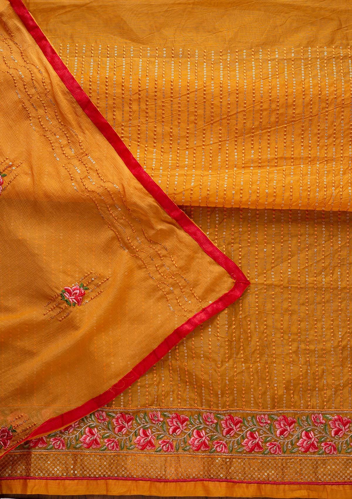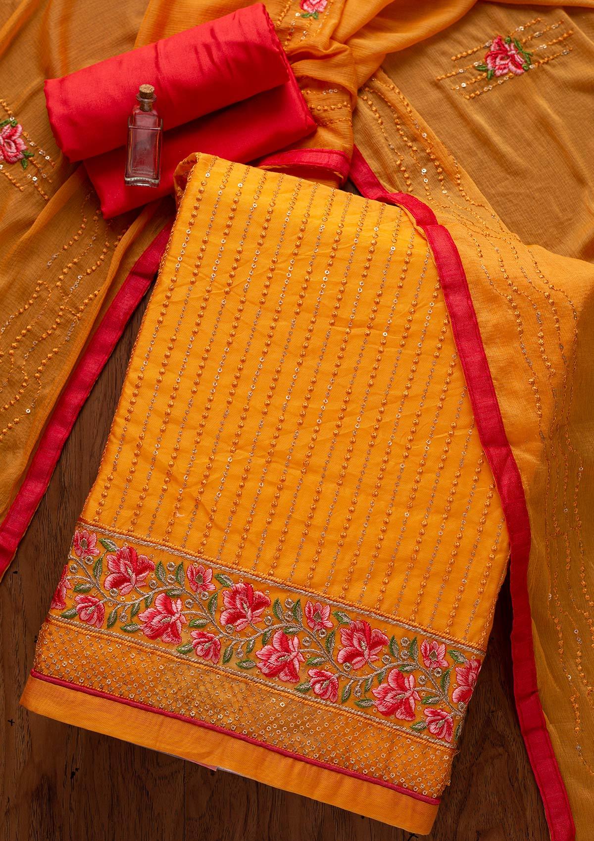 Mustard Salwar Suit In Chanderi Fabric. The Salwar Suit Is Embellished With Threadwork Embroidery. Accompanied with an unstitched bottom and dupatta. Comes With The Koskii Promise Of Premium Quality.