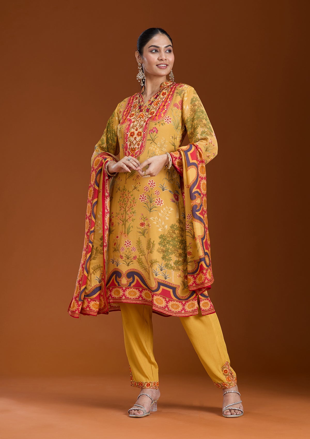 Mustard Yellow Salwar Suit in Crepe fabric. The Salwar Suit is embellished with Printed embroidery. Accompanied with a bottom and dupatta. Comes with the Koskii promise of premium quality.