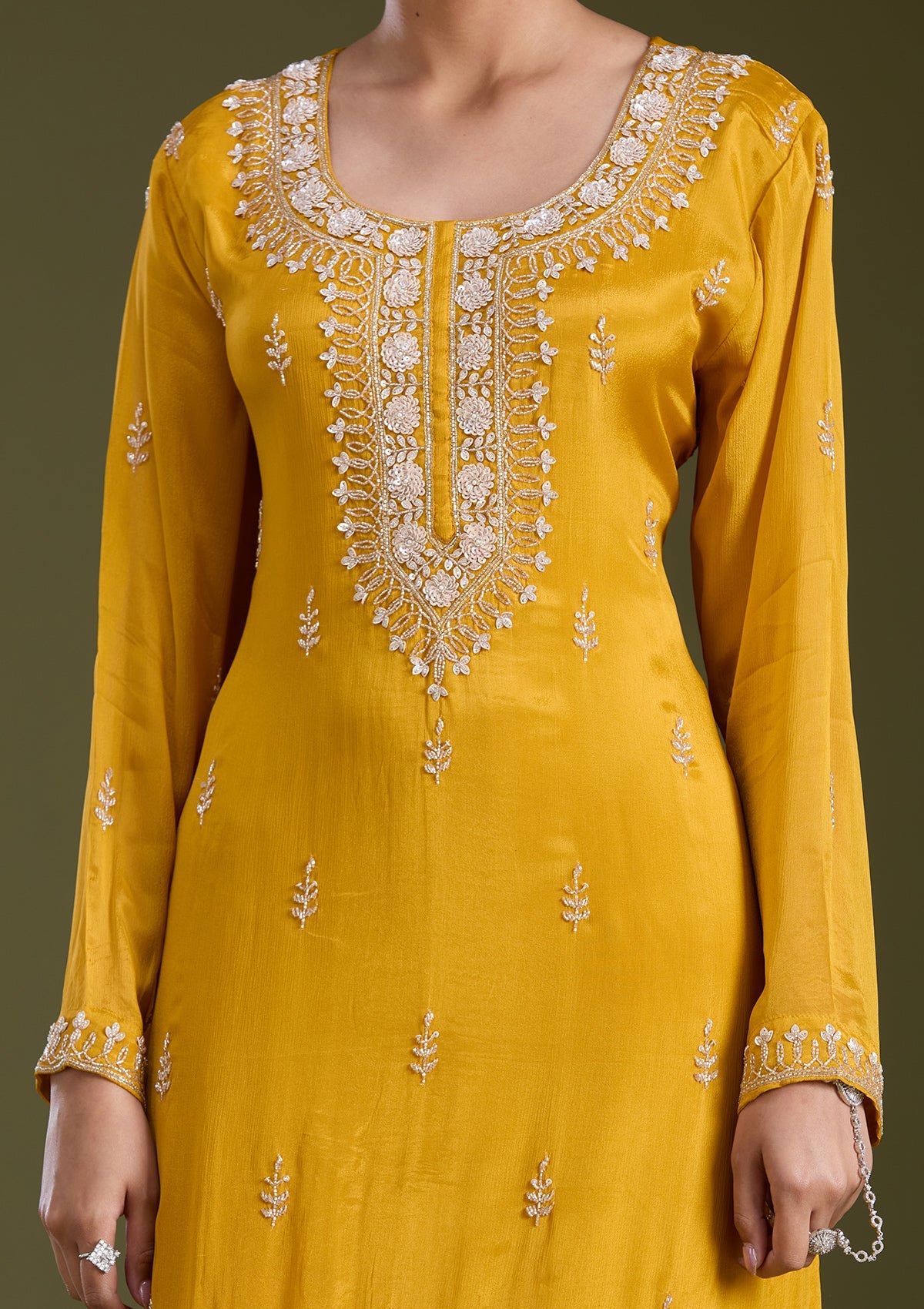 Mustard Yellow Salwar_RM in Soft Raw Silk fabric. The Salwar_RM is embellished with Sequins embroidery. Accompanied with a bottom and dupatta. Comes with the Koskii promise of premium quality.