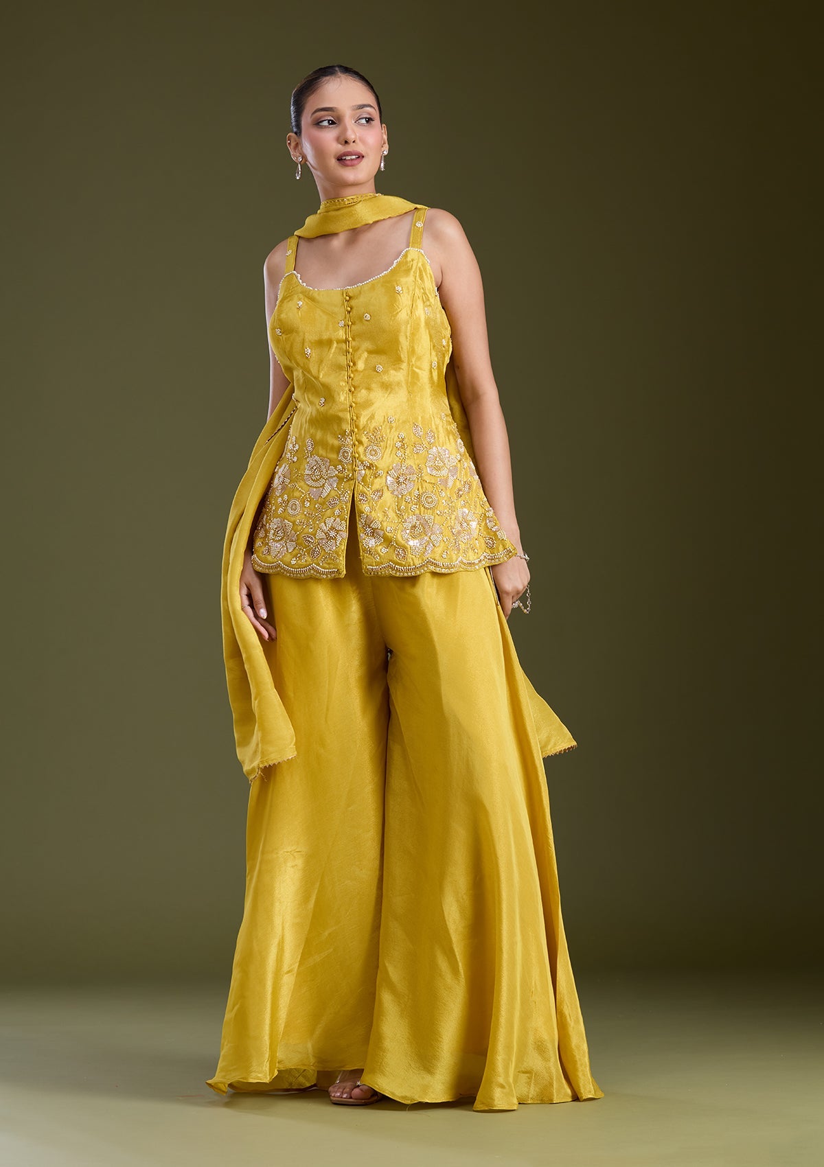 Mustard Yellow Salwar_RM in Satin fabric. The Salwar_RM is embellished with Threadwork embroidery. Accompanied with a bottom and dupatta. Comes with the Koskii promise of premium quality.