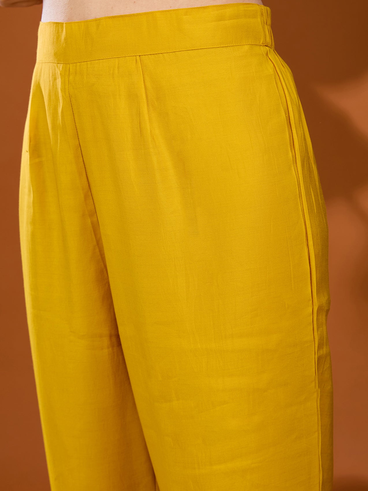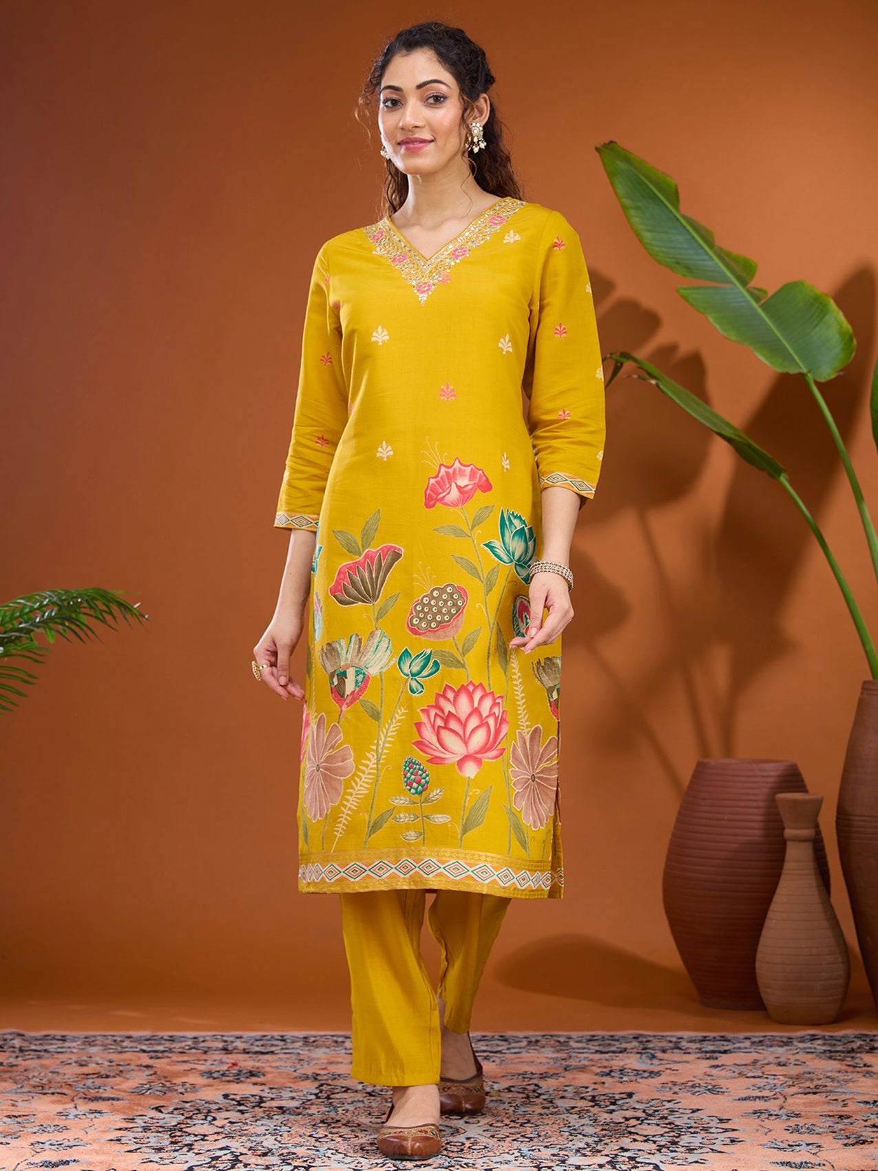 Mustard Yellow Salwar Suit in Soft Raw Silk fabric. The Salwar Suit is embellished with Threadwork embroidery. Accompanied with a bottom and dupatta. Comes with the Koskii promise of premium quality.