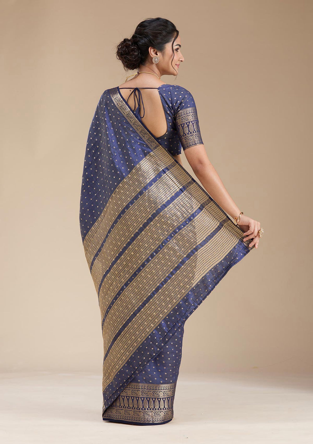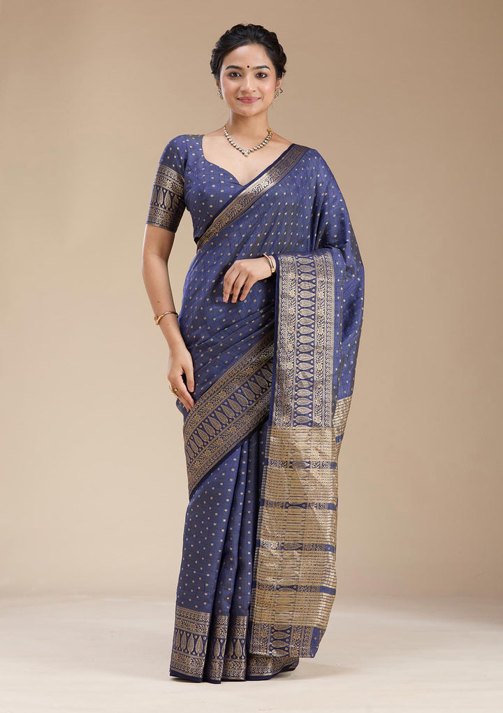 Navy Blue Saree in Silk fabric. The Silk Saree is elevated with Kanjivaram embroidery. It comes with an Unstitched blouse. Comes with the Koskii promise of premium quality.