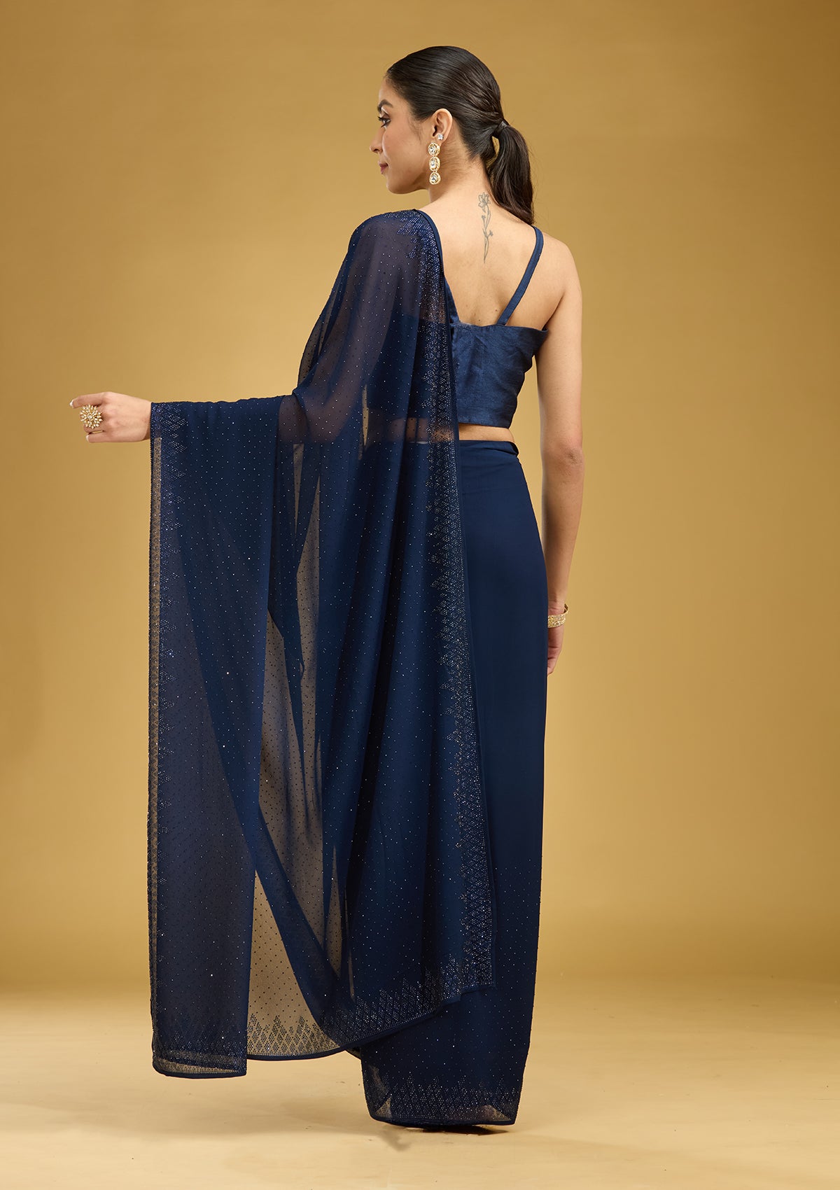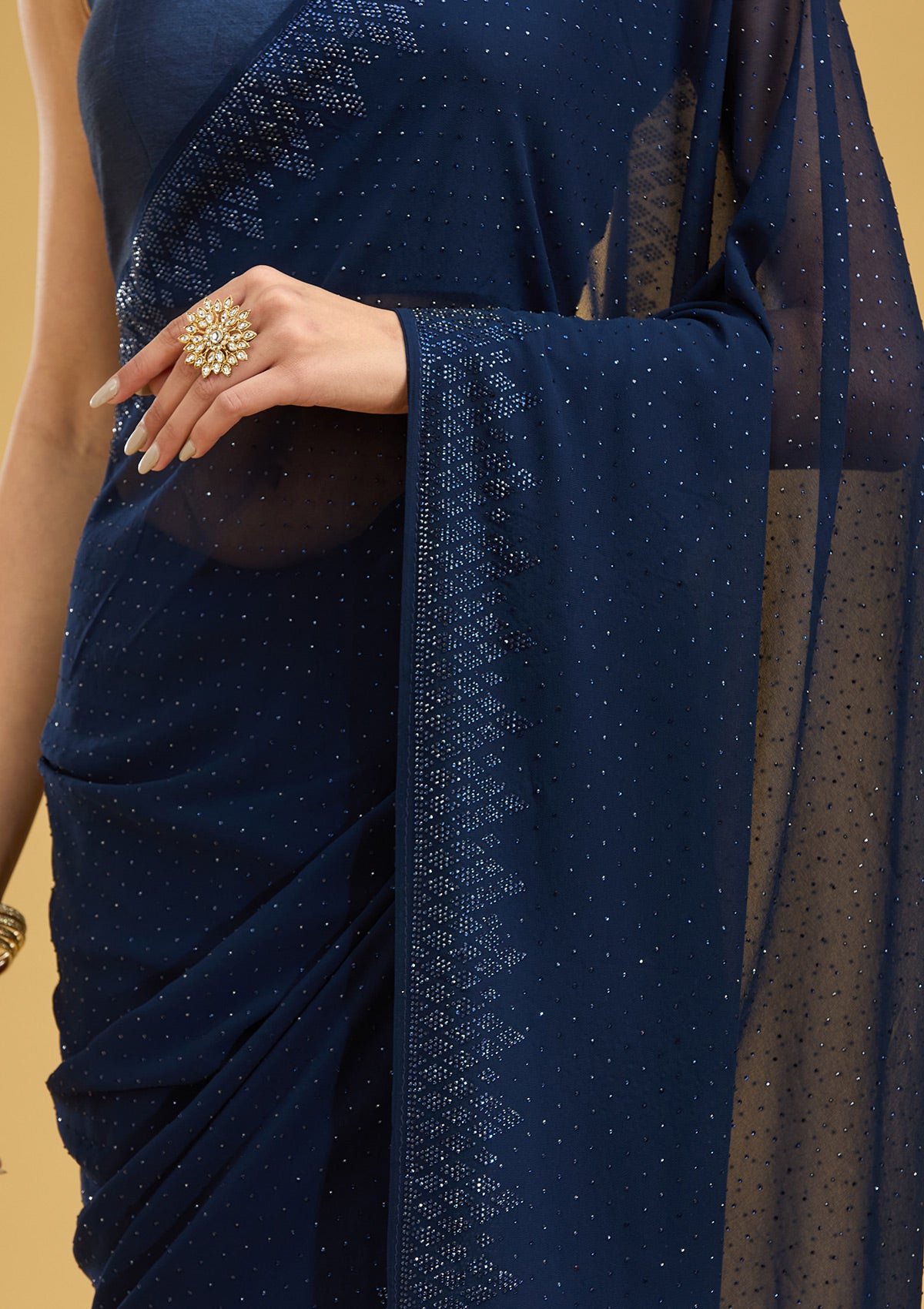 Navy Blue Saree in Georgette fabric. The Saree is elevated with Swarovski embroidery. It comes with an Unstitched blouse. Comes with the Koskii promise of premium quality.
