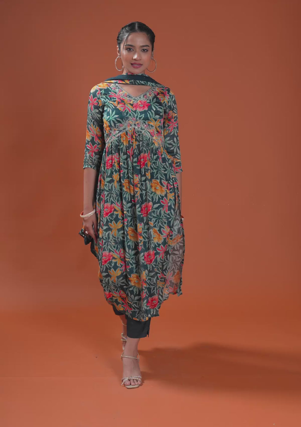 Unleash your vibrant side with Koskii’s Multicolor Georgette Salwar Suit, a readymade extravaganza of lively threadwork embroidery that dances across premium georgette fabric. This spirited ensemble sparkles with an expressive array of floral motifs, perfectly tailored to elevate your every move with grace and vivacity. Slip into this dazzling creation for seamless elegance and an unforgettable flair at any evening affair!.