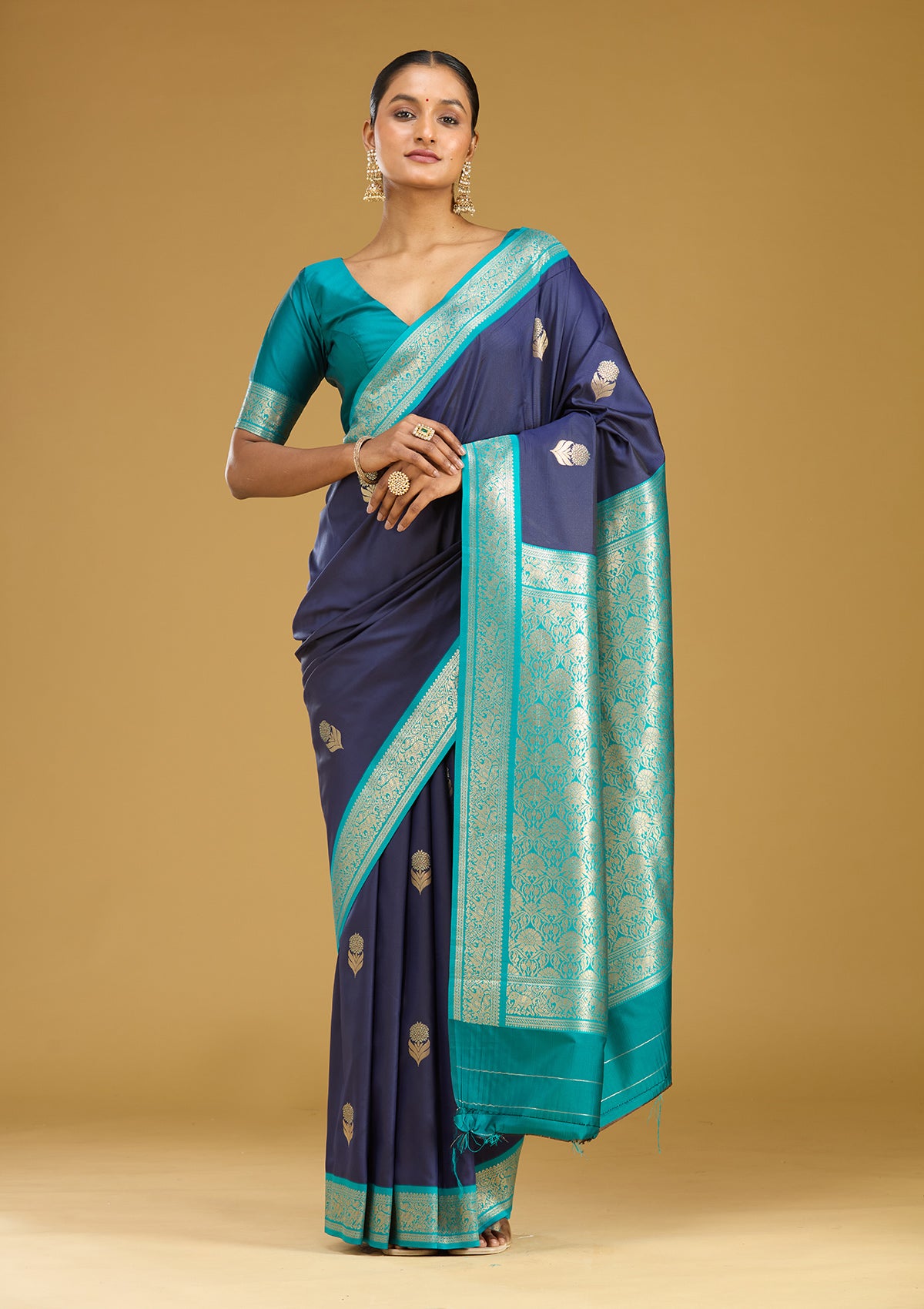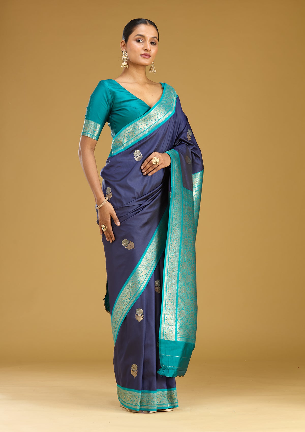 Navy Blue Silk_Saree in Silk fabric. The Silk_Saree is elevated with Zariwork (Gold) embroidery. It comes with an Unstitched blouse. Comes with the Koskii promise of premium quality.