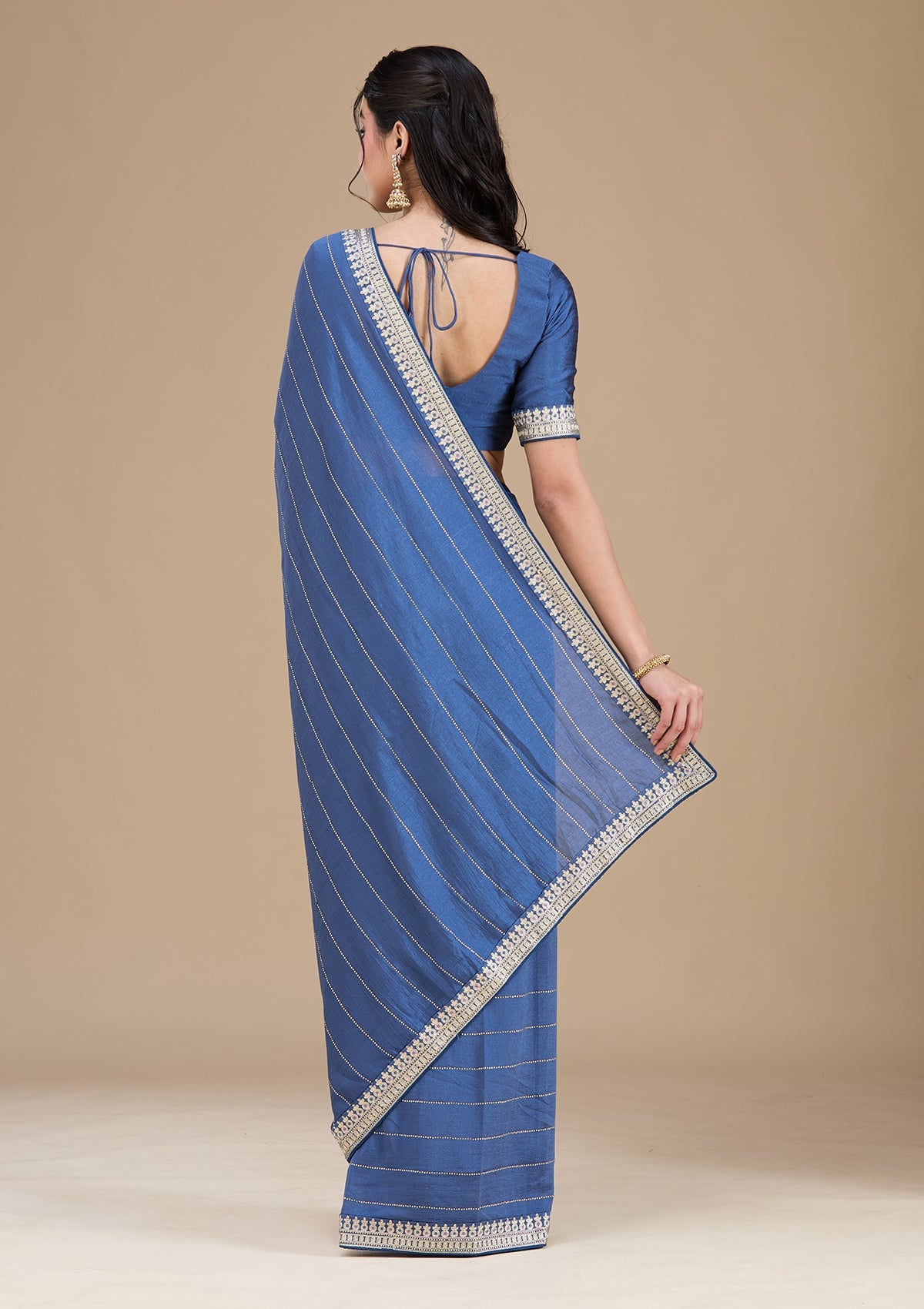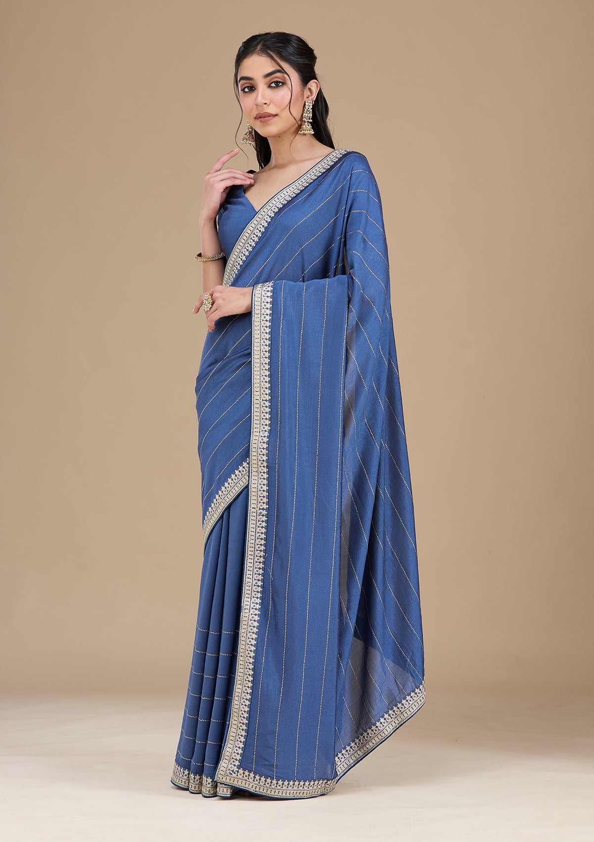 Navy Blue Saree in Soft Raw Silk fabric. The Saree is elevated with Zariwork (Silver) embroidery. It comes with an Unstitched blouse. Comes with the Koskii promise of premium quality.