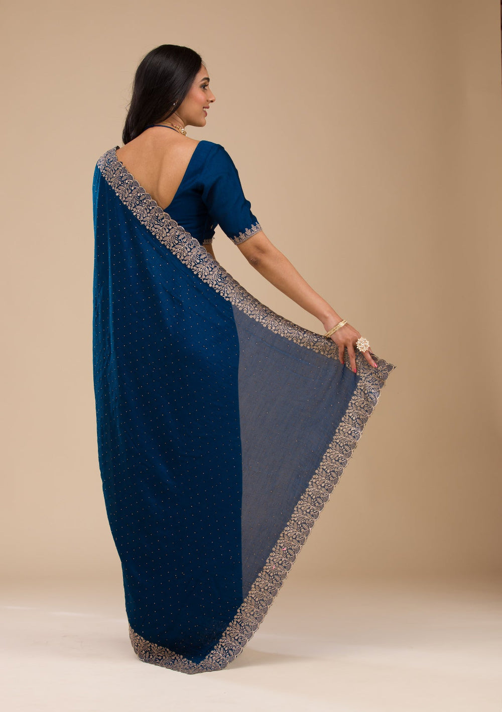 Navy Blue Saree in Soft Silk fabric. The Saree is elevated with Zariwork embroidery. It comes with an Unstitched blouse. Comes with the Koskii promise of premium quality.