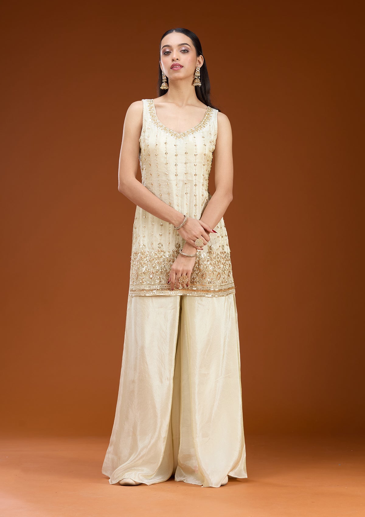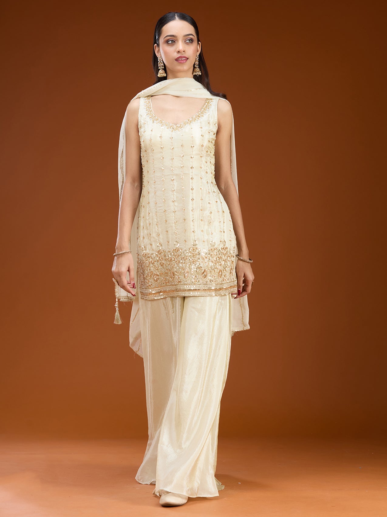 Off White Salwar_RM in Tissue fabric. The Salwar_RM is embellished with Cutdana embroidery. Accompanied with a bottom and dupatta. Comes with the Koskii promise of premium quality.