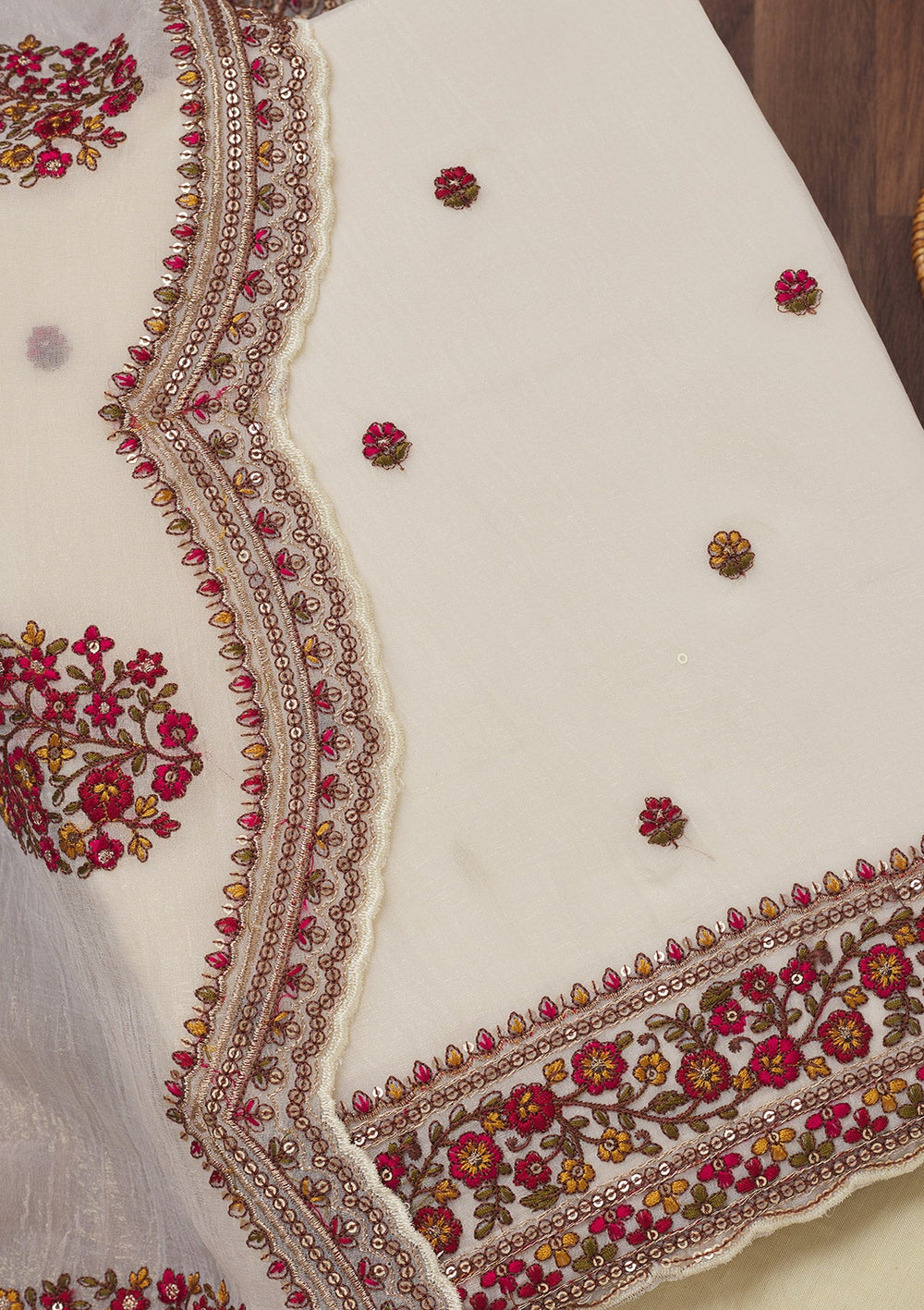 Off White Threadwork Chiffon Unstitched Salwar Suit