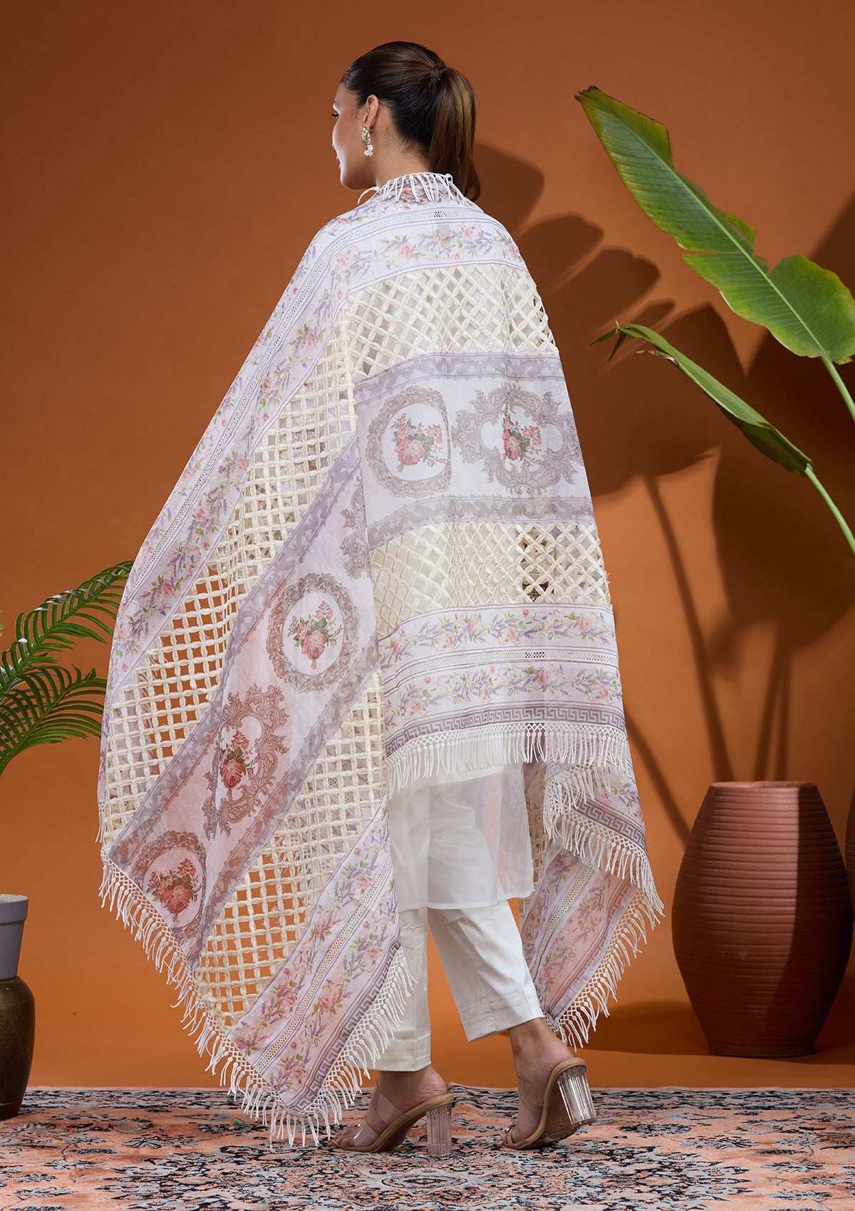 Off White Salwar_RM in Tissue fabric. The Salwar_RM is embellished with Threadwork embroidery. Accompanied with a bottom and dupatta. Comes with the Koskii promise of premium quality.