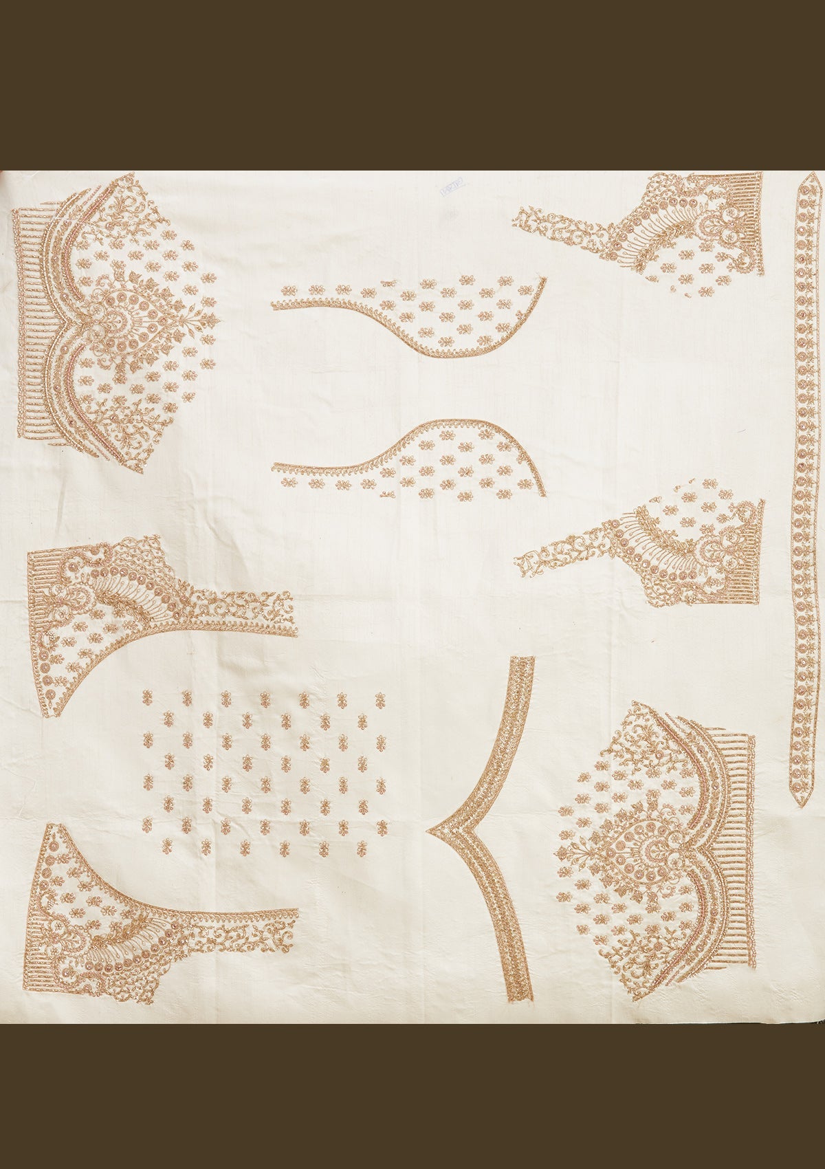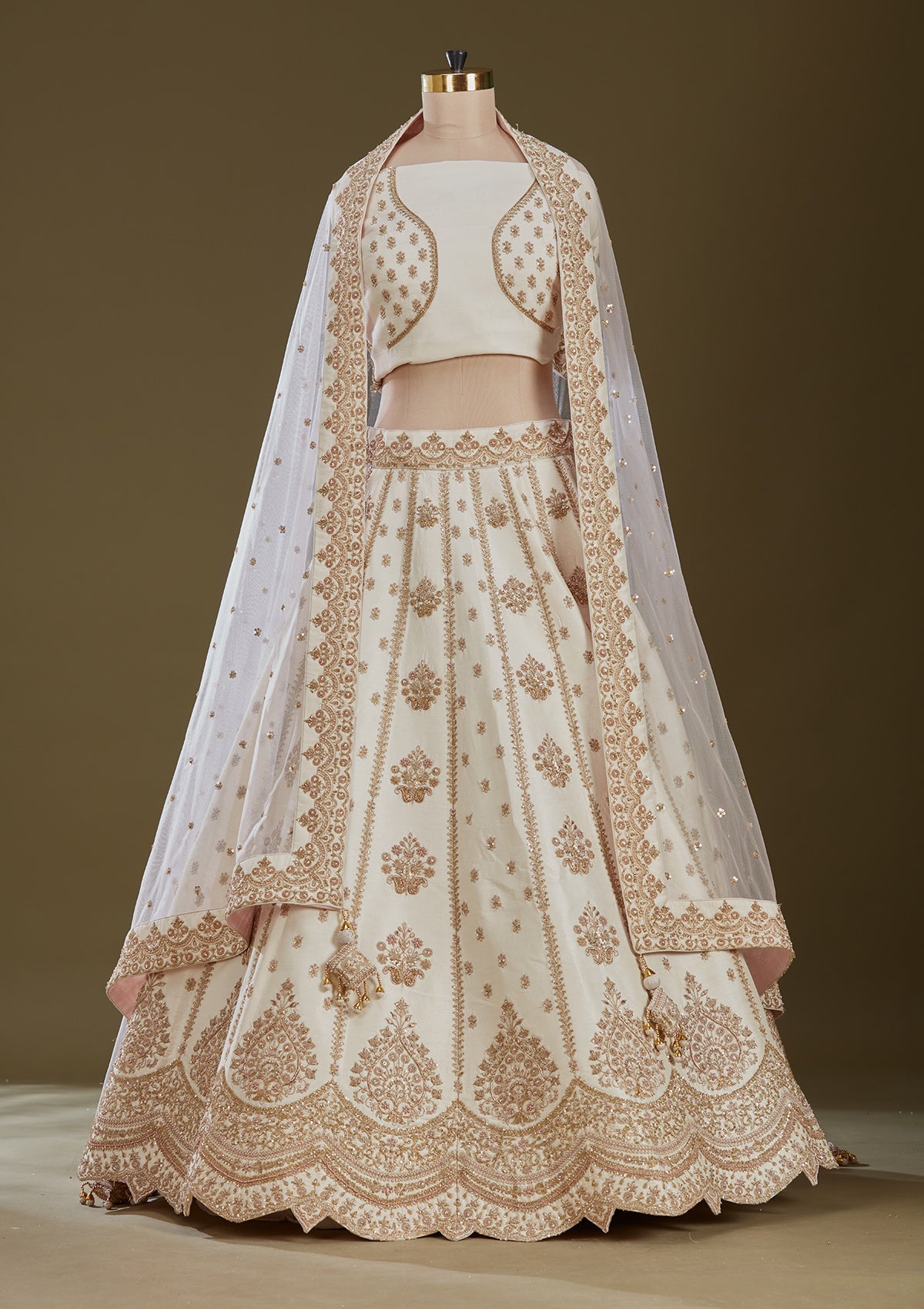 Off White Readymade Lehenga in Raw Silk fabric. The Lehenga is embellished with Zardozi (Gold) embroidery. Accompanied with an Readymade blouse and dupatta. Comes with the Koskii promise of premium quality.