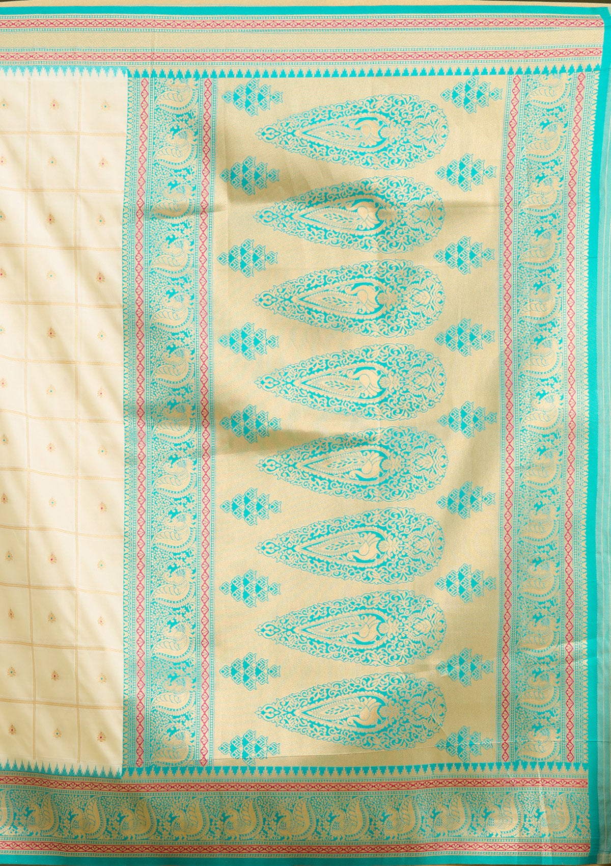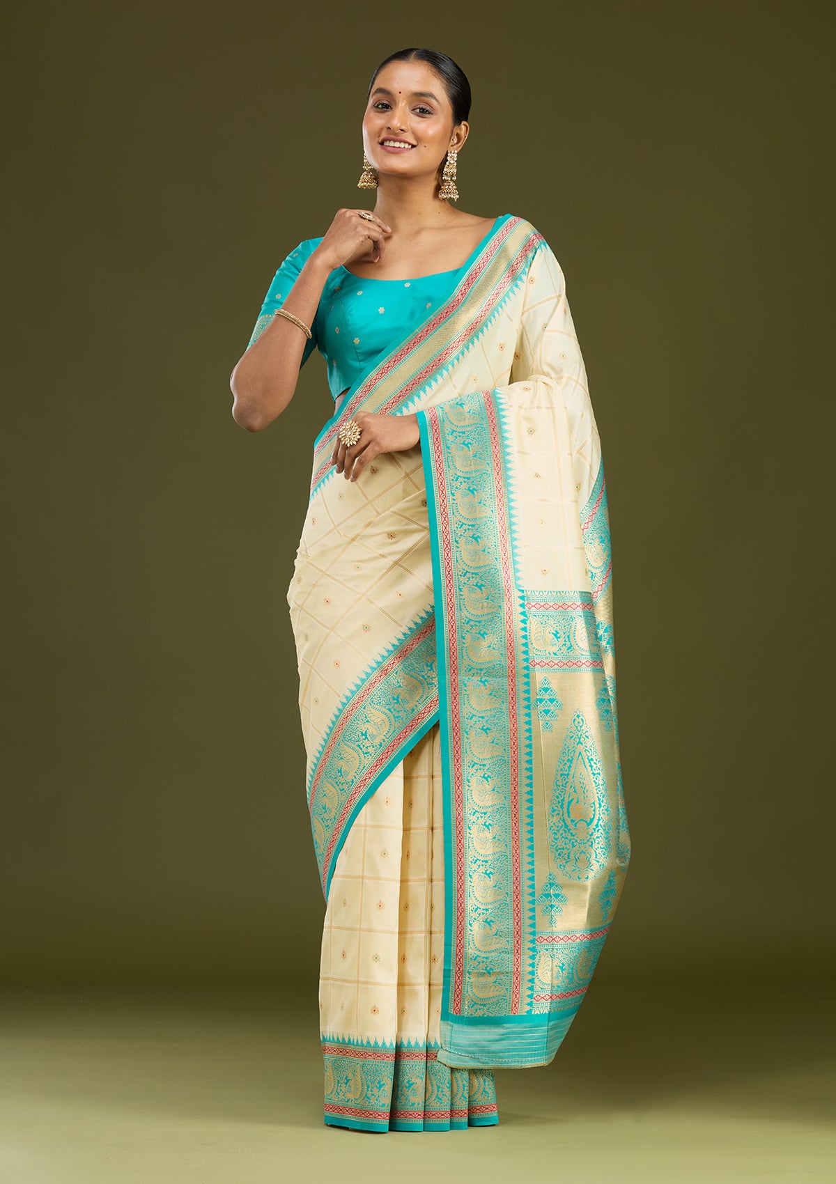 Off White Silk_Saree in Silk fabric. The Silk_Saree is elevated with Zariwork (Gold) embroidery. It comes with an Unstitched blouse. Comes with the Koskii promise of premium quality.