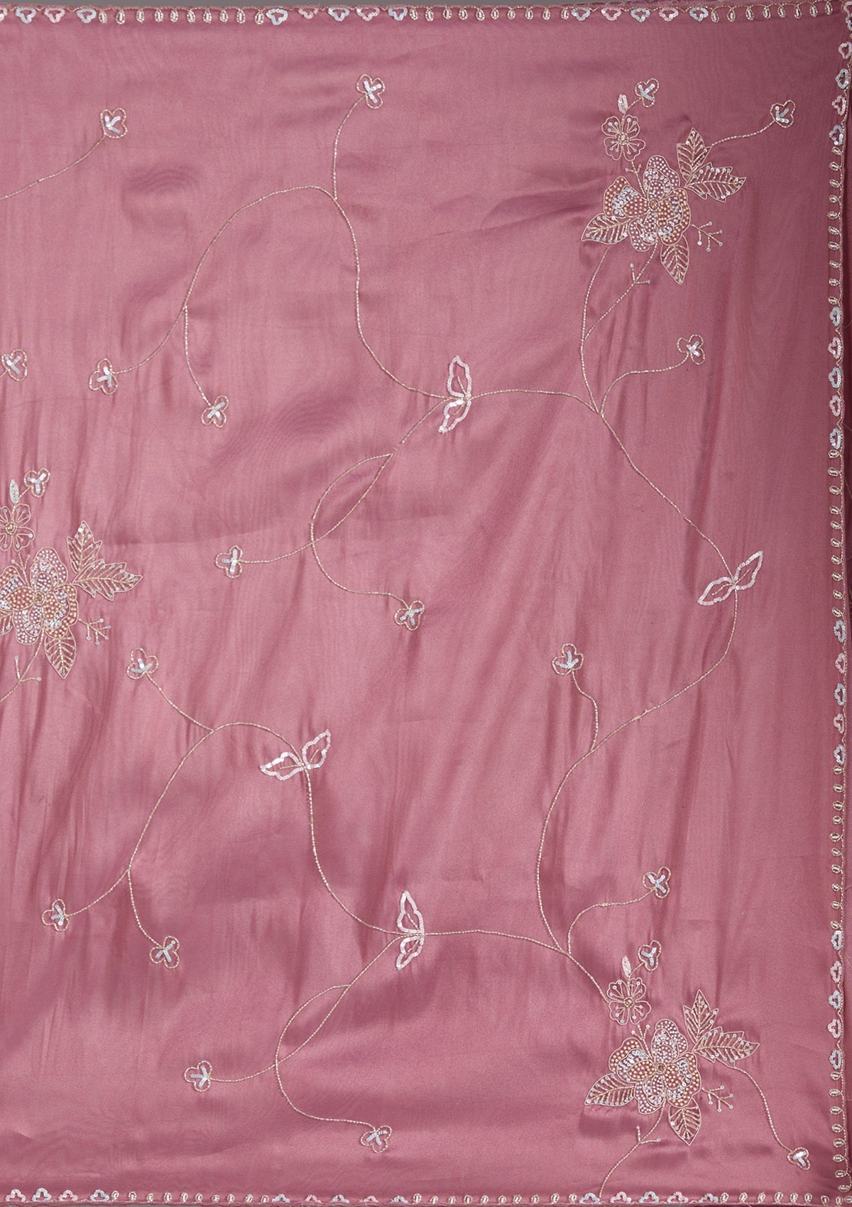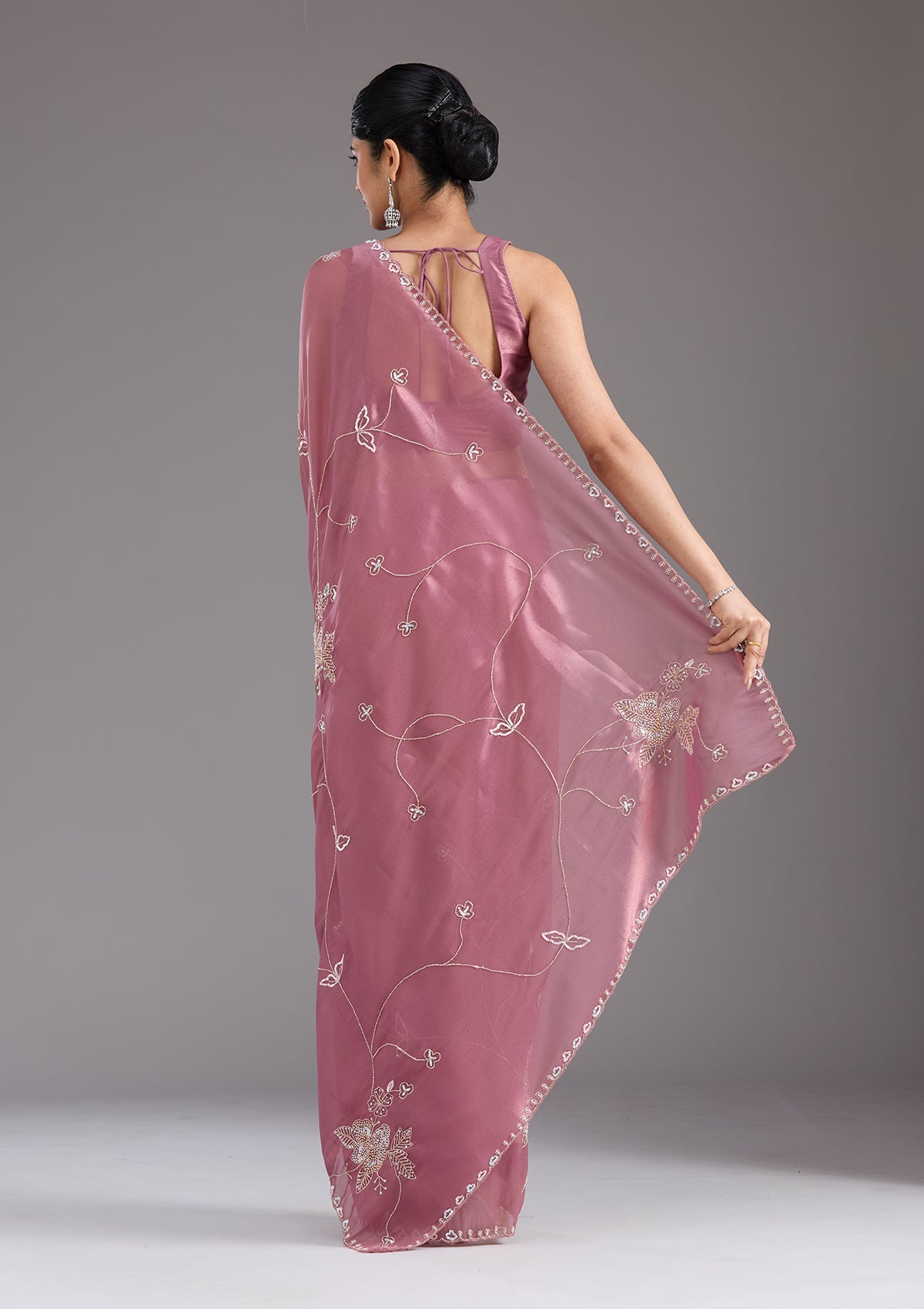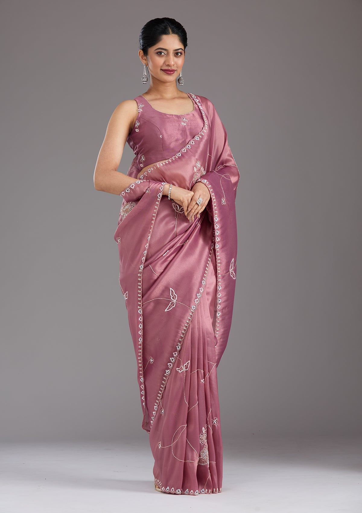 Onion Pink Saree in Tissue fabric. The Saree is elevated with Aariwork embroidery. It comes with an Unstitched blouse. Comes with the Koskii promise of premium quality.