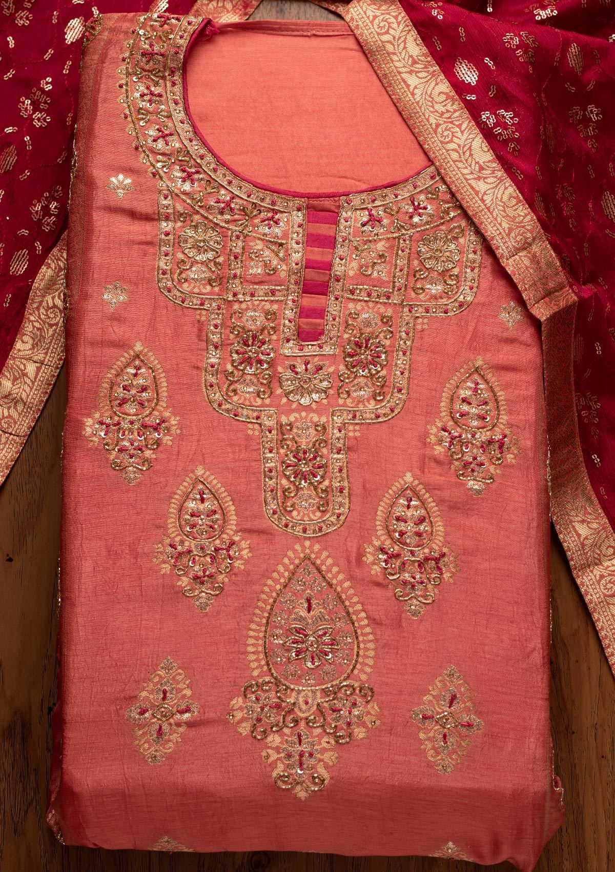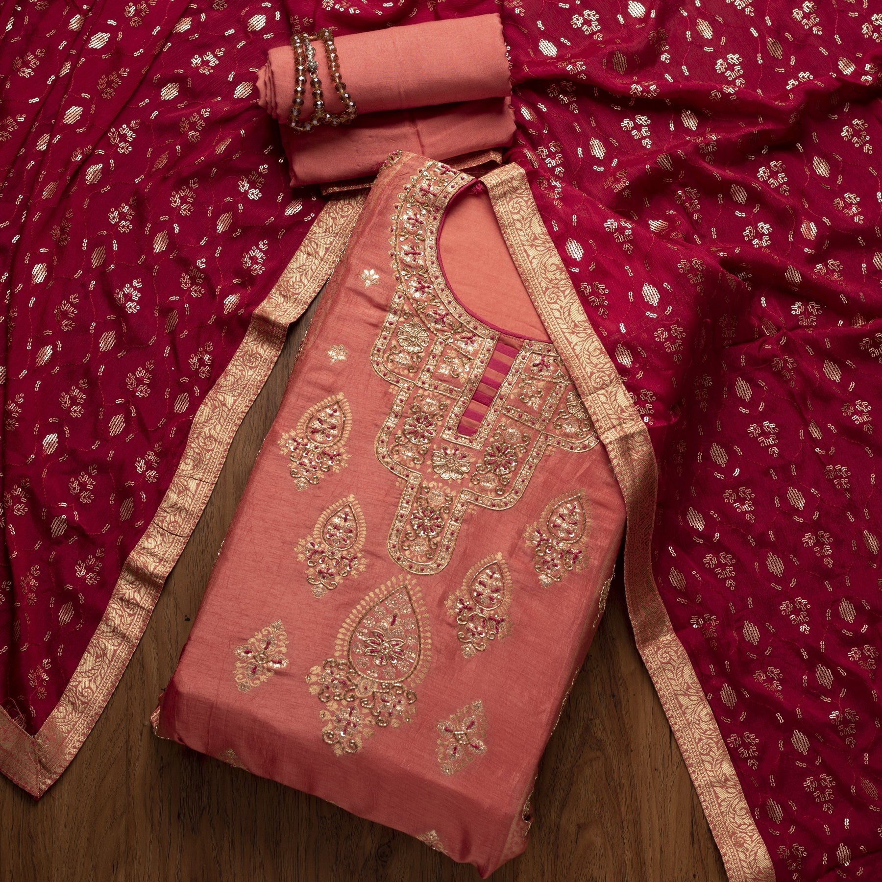 Onion Pink Salwar Suit In Banarasi Fabric. The Salwar Suit Is Embellished With Cutdana Embroidery. Accompanied with an unstitched bottom and dupatta. Comes With The Koskii Promise Of Premium Quality.