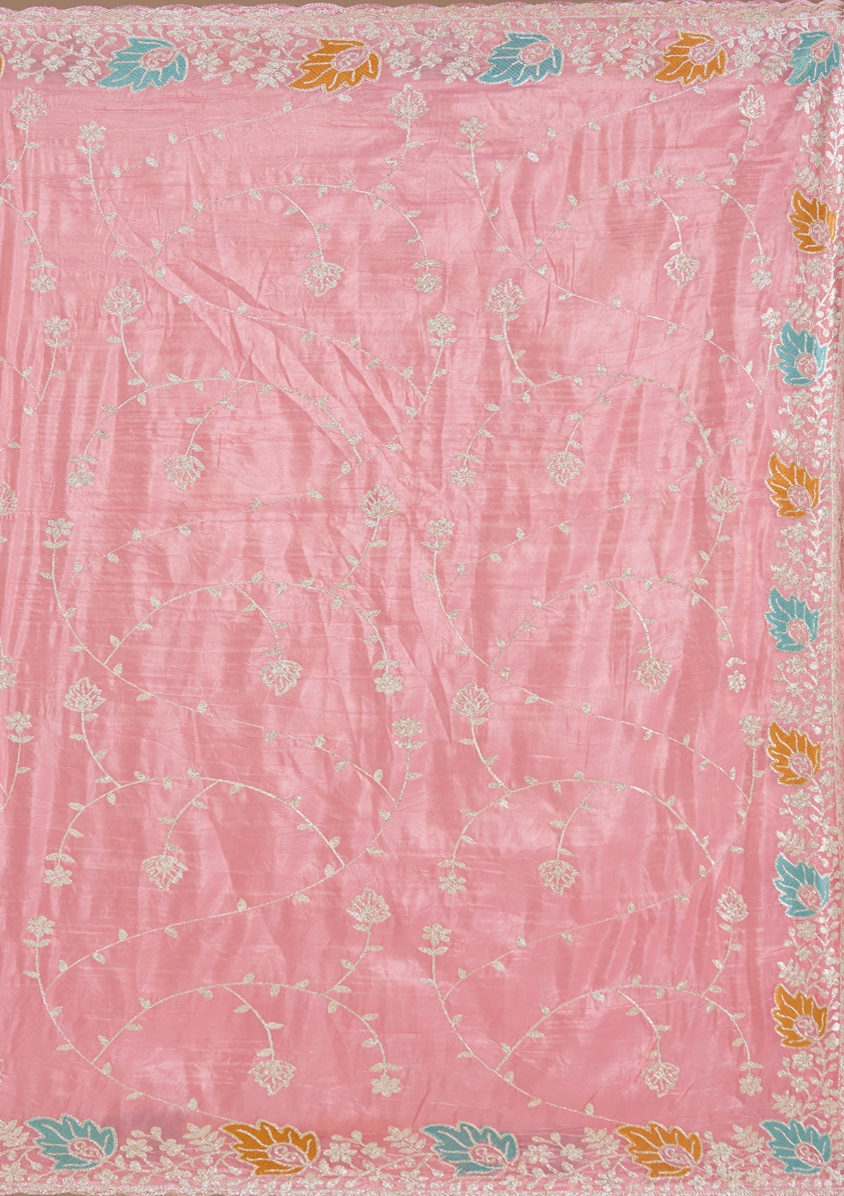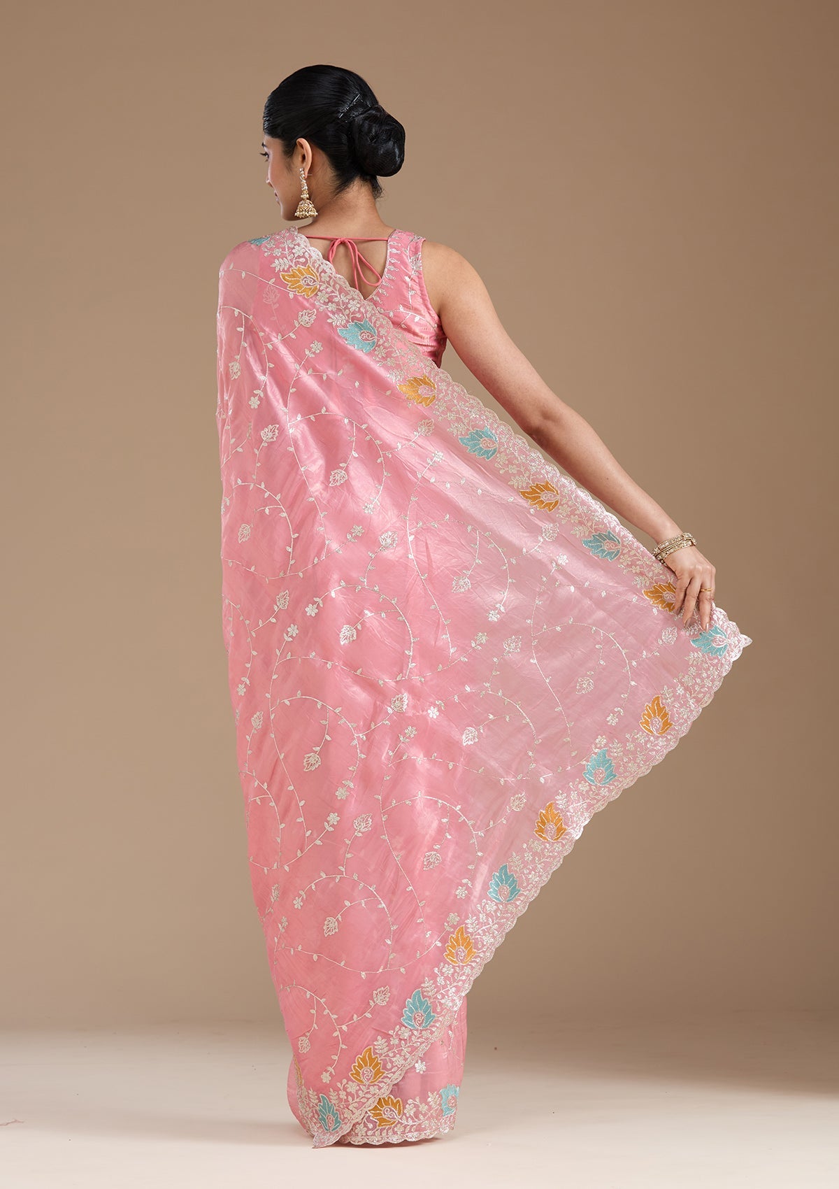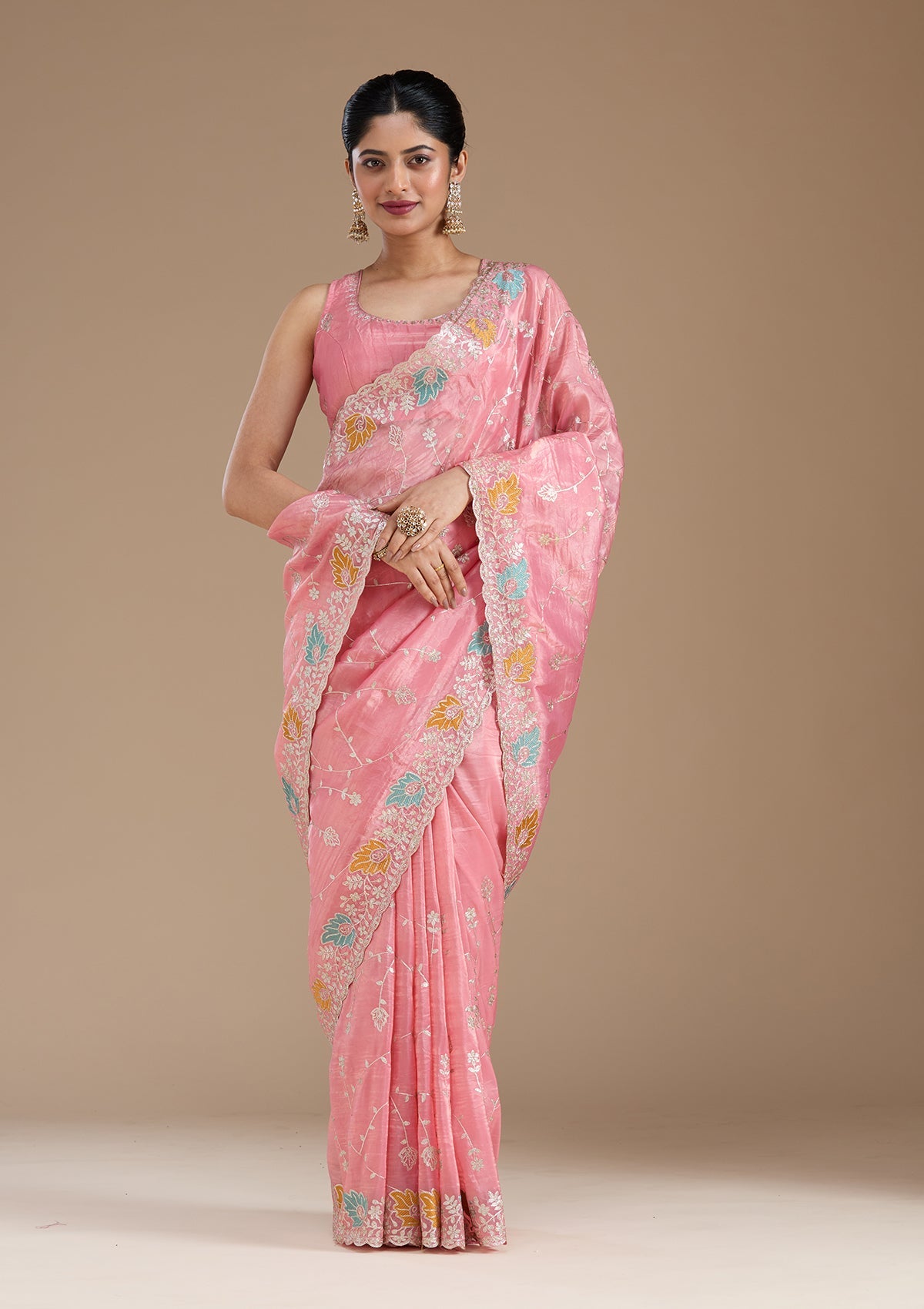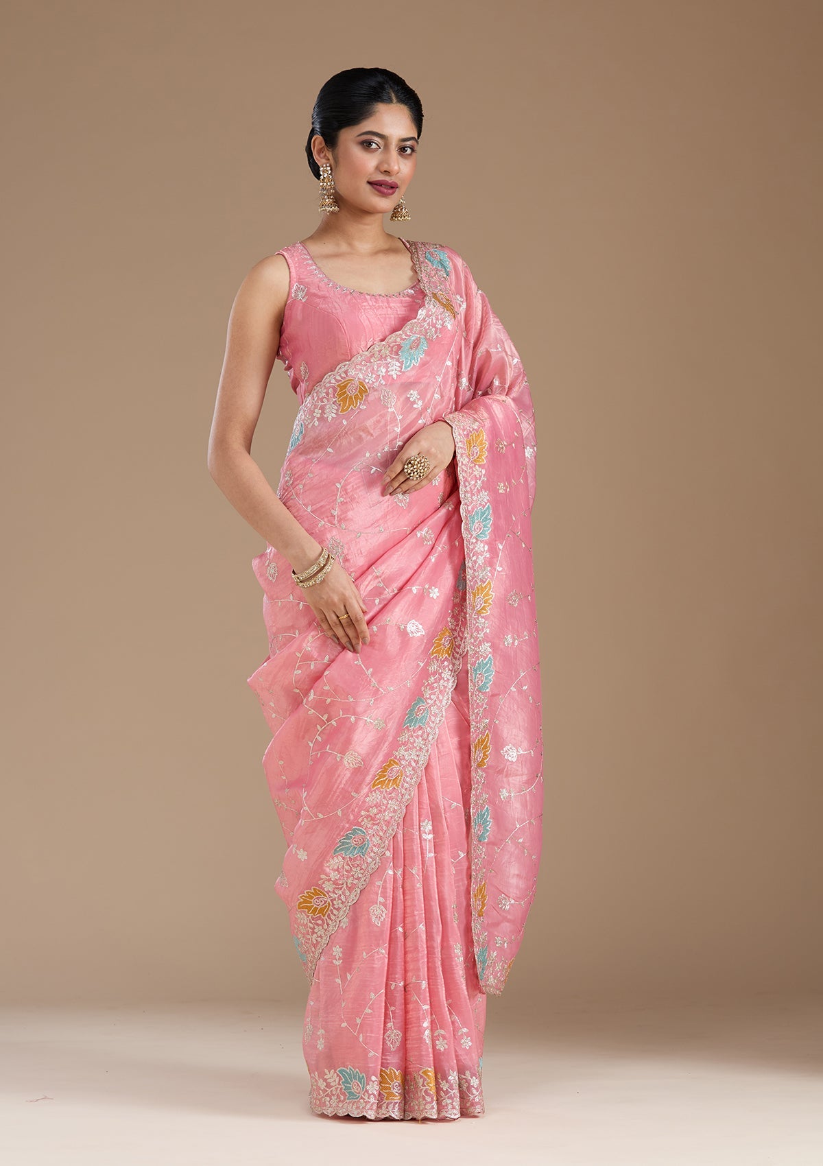 Onion Pink Saree in Organza fabric. The Saree is elevated with Gotapatti embroidery. It comes with an Unstitched blouse. Comes with the Koskii promise of premium quality.
