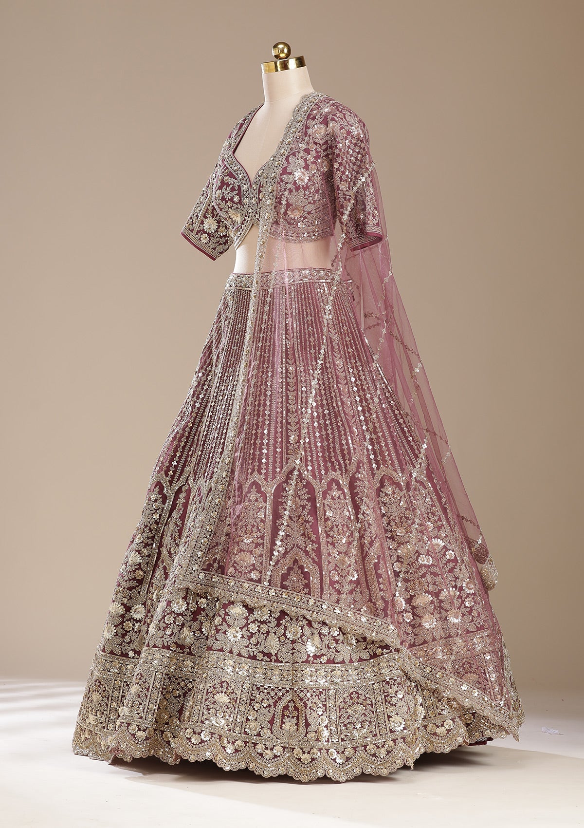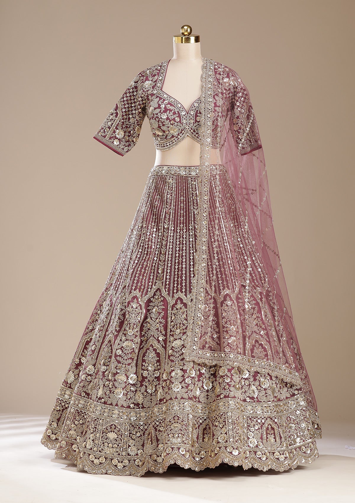 Onion Pink Readymade Lehenga in Net fabric. The Lehenga is embellished with Sequins embroidery. Accompanied with an Readymade blouse and dupatta. Comes with the Koskii promise of premium quality.