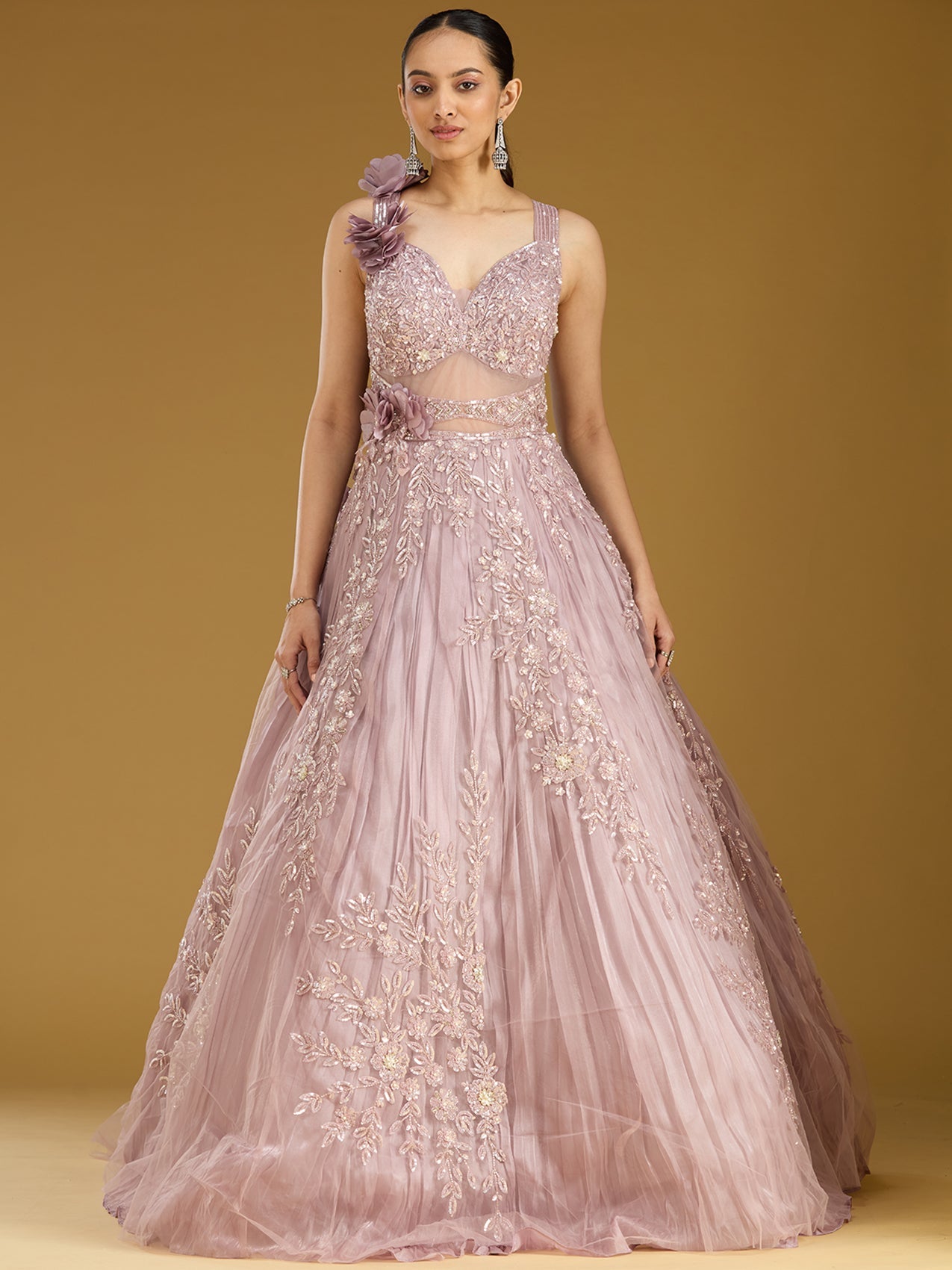 Onion Pink Readymade Gown in Tissue fabric. The Gown is embellished with Stonework (Silver) embroidery. The Onion Pink Gown has a Sweetheart Neck. Comes with the Koskii promise of premium quality.