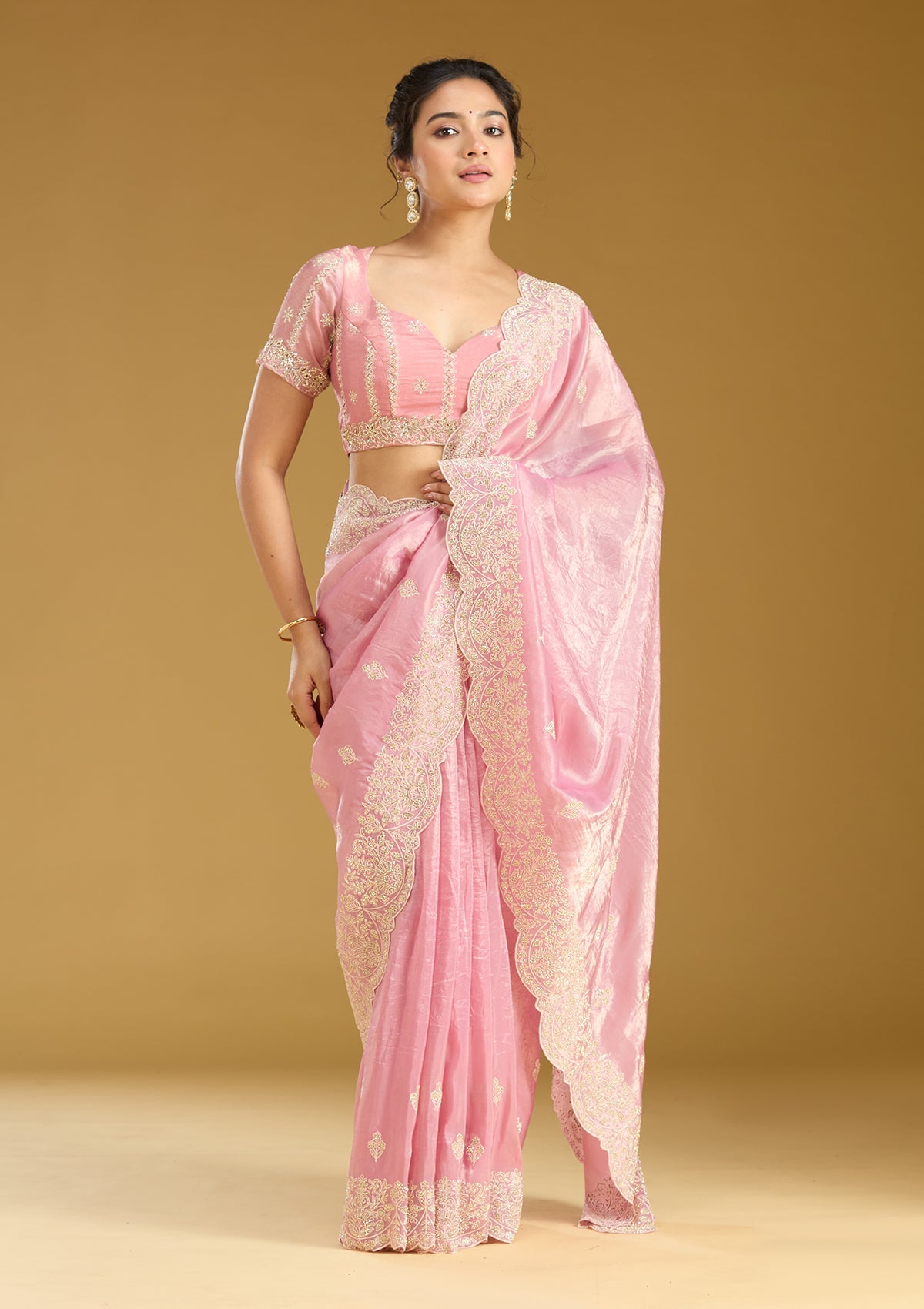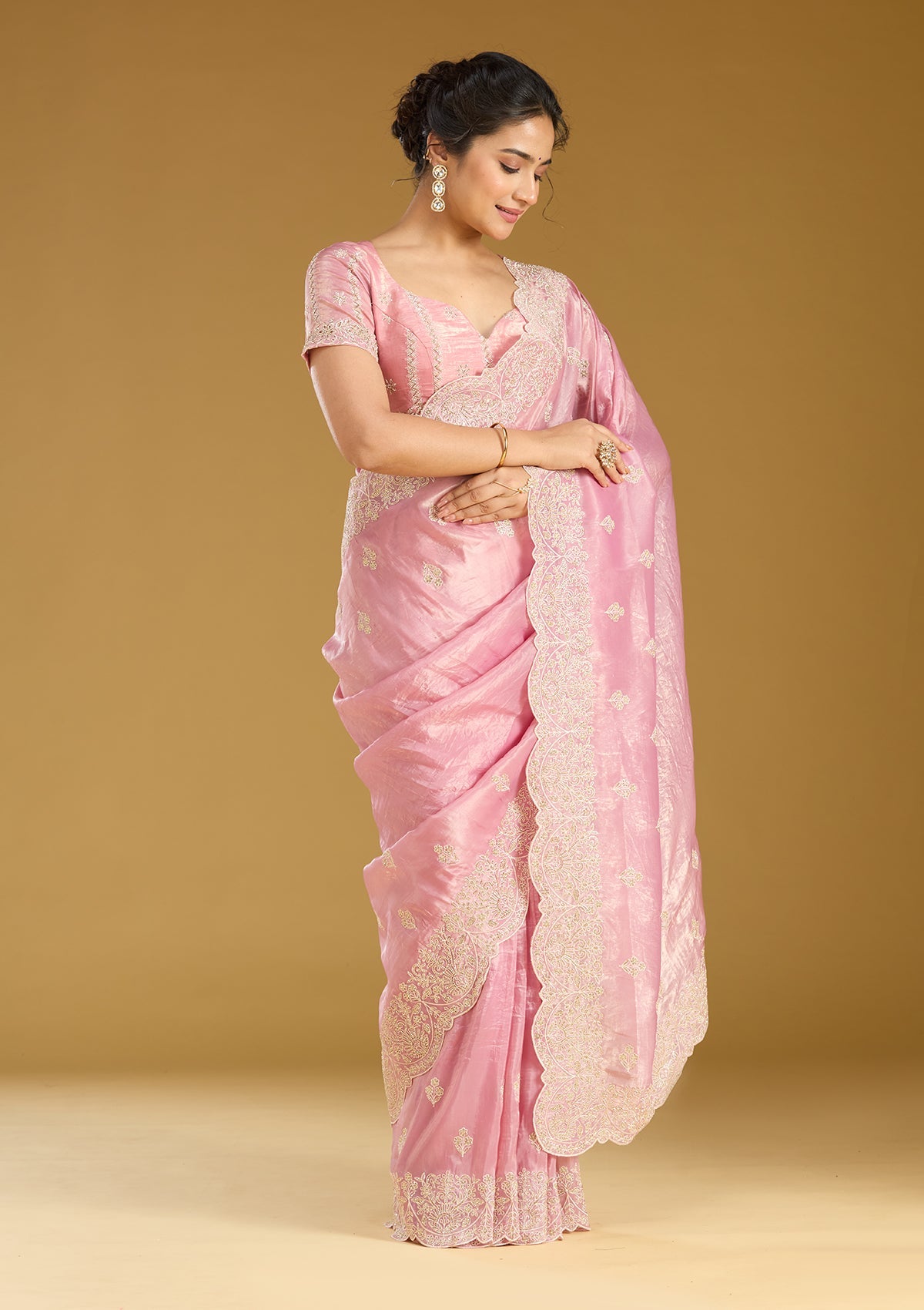 Onion Pink Saree in Organza fabric. The Saree is elevated with Threadwork embroidery. It comes with an Unstitched blouse. Comes with the Koskii promise of premium quality.