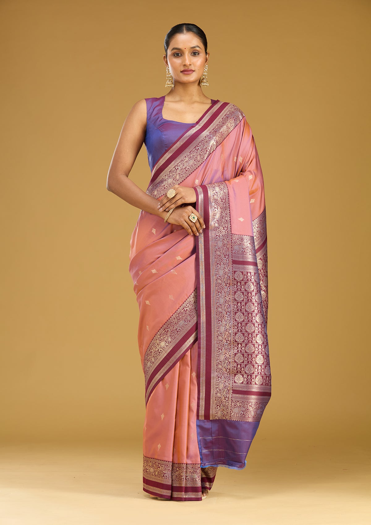 Onion Pink Silk_Saree in Silk fabric. The Silk_Saree is elevated with Zariwork (Gold) embroidery. It comes with an Unstitched blouse. Comes with the Koskii promise of premium quality.