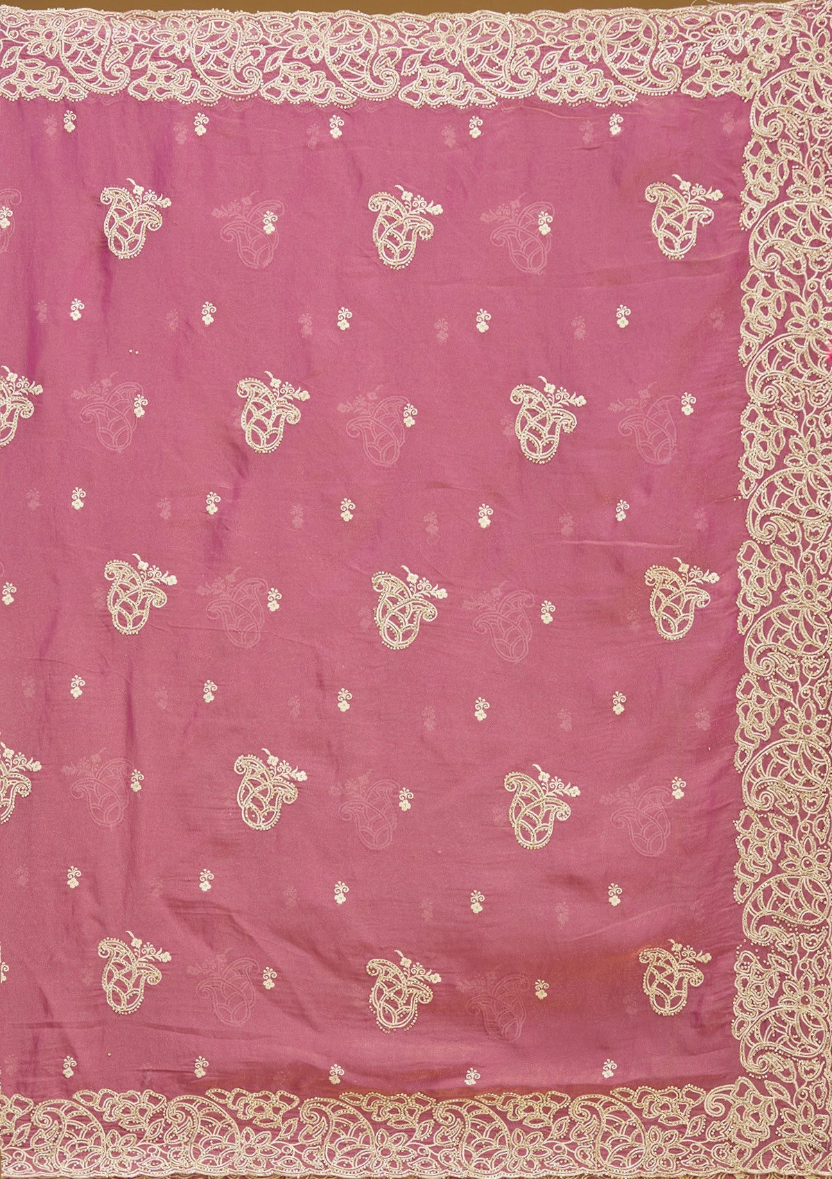Onion Pink Saree in Tissue fabric. The Saree is elevated with Zariwork (Silver) embroidery. It comes with an Unstitched blouse. Comes with the Koskii promise of premium quality.