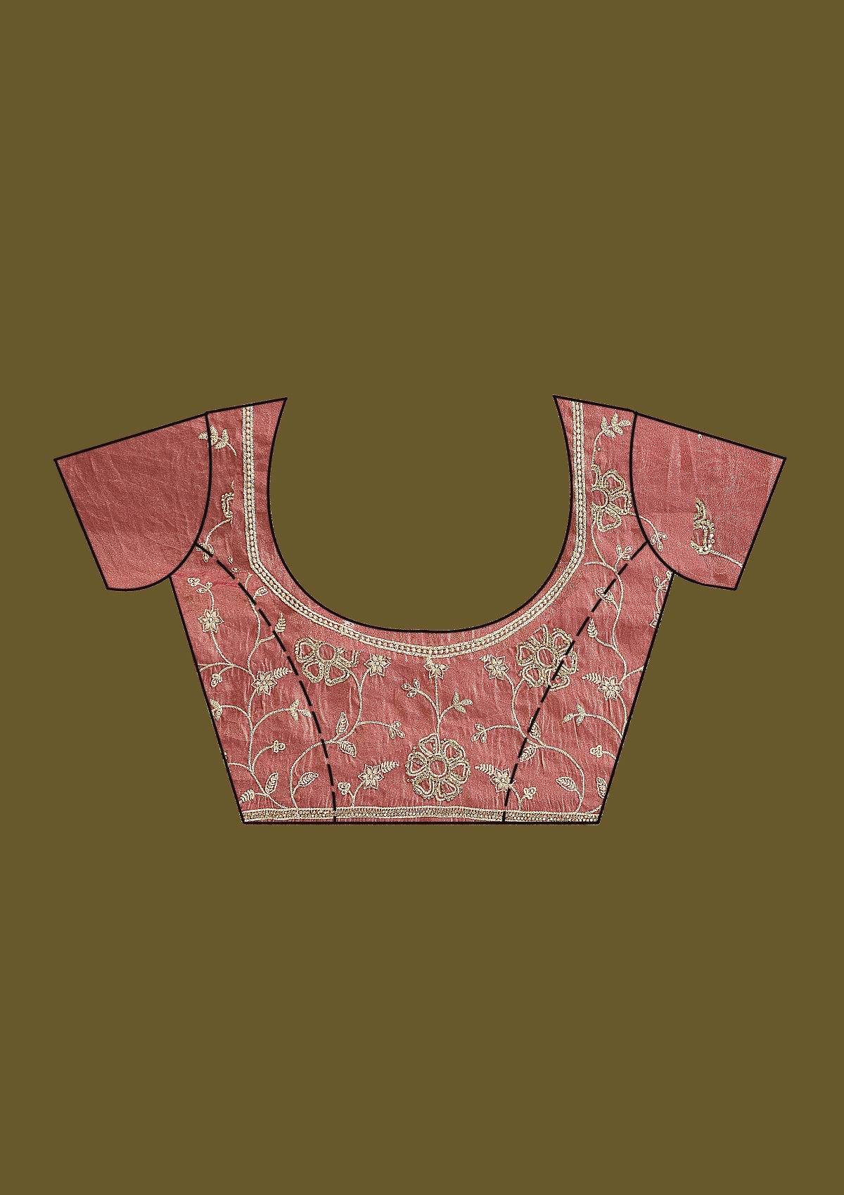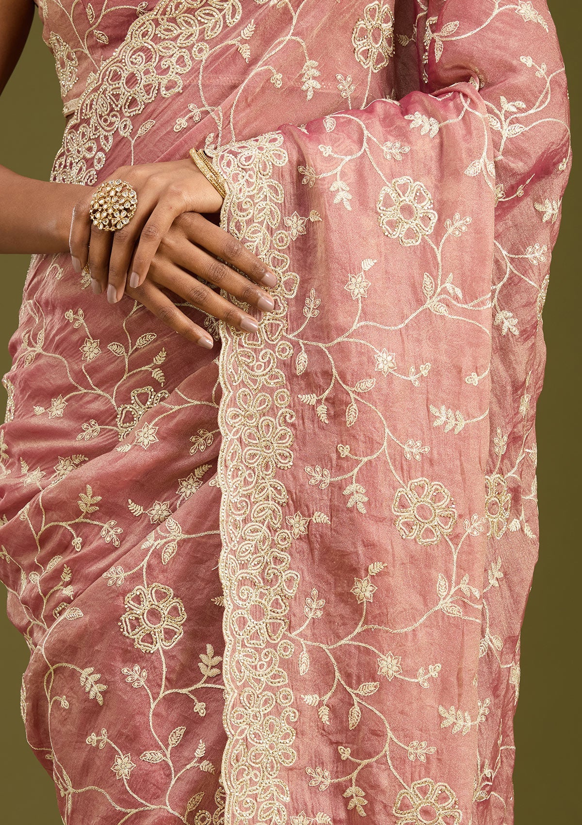 Onion Pink Saree in Tissue fabric. The Saree is elevated with Zariwork (Silver) embroidery. It comes with an Unstitched blouse. Comes with the Koskii promise of premium quality.