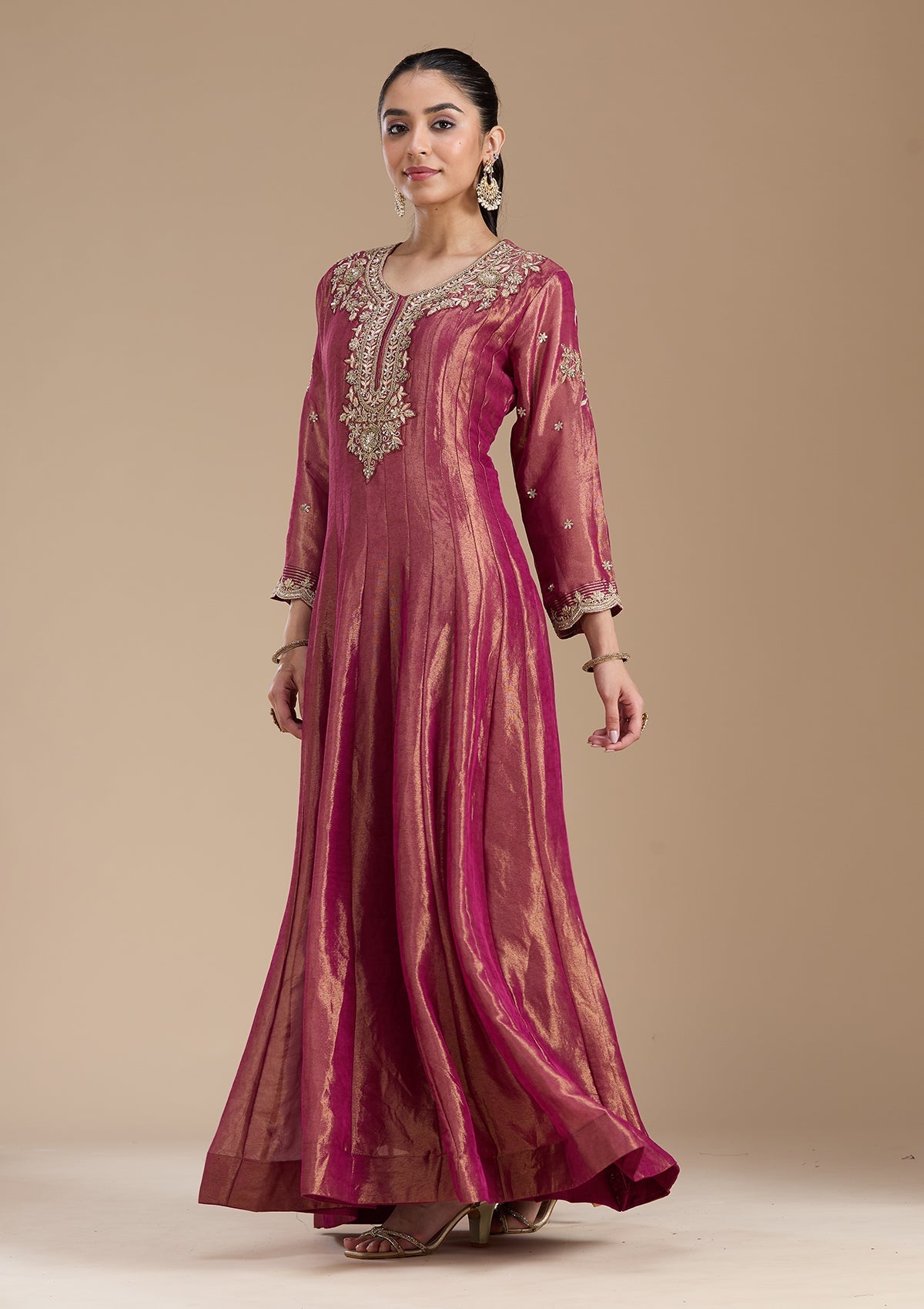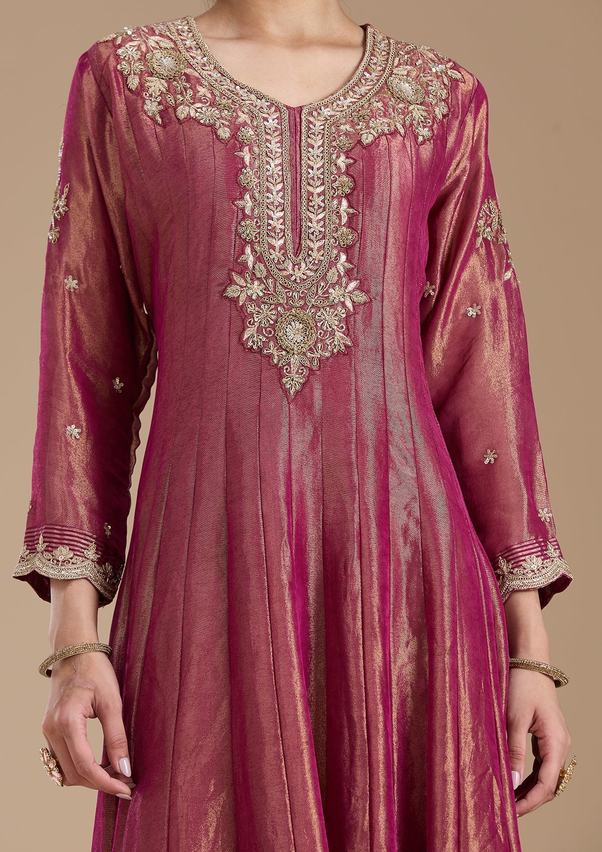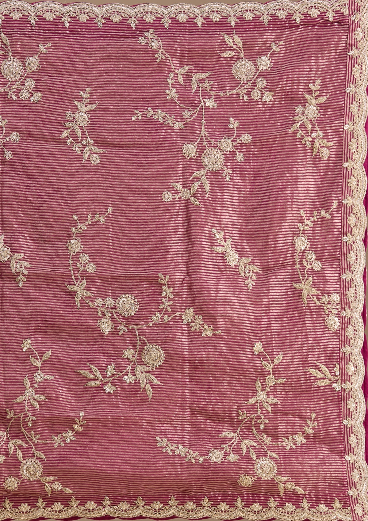 Onion Pink Salwar Suit in Tissue fabric. The Salwar Suit is embellished with Zariwork embroidery. Accompanied with a bottom and dupatta. Comes with the Koskii promise of premium quality.