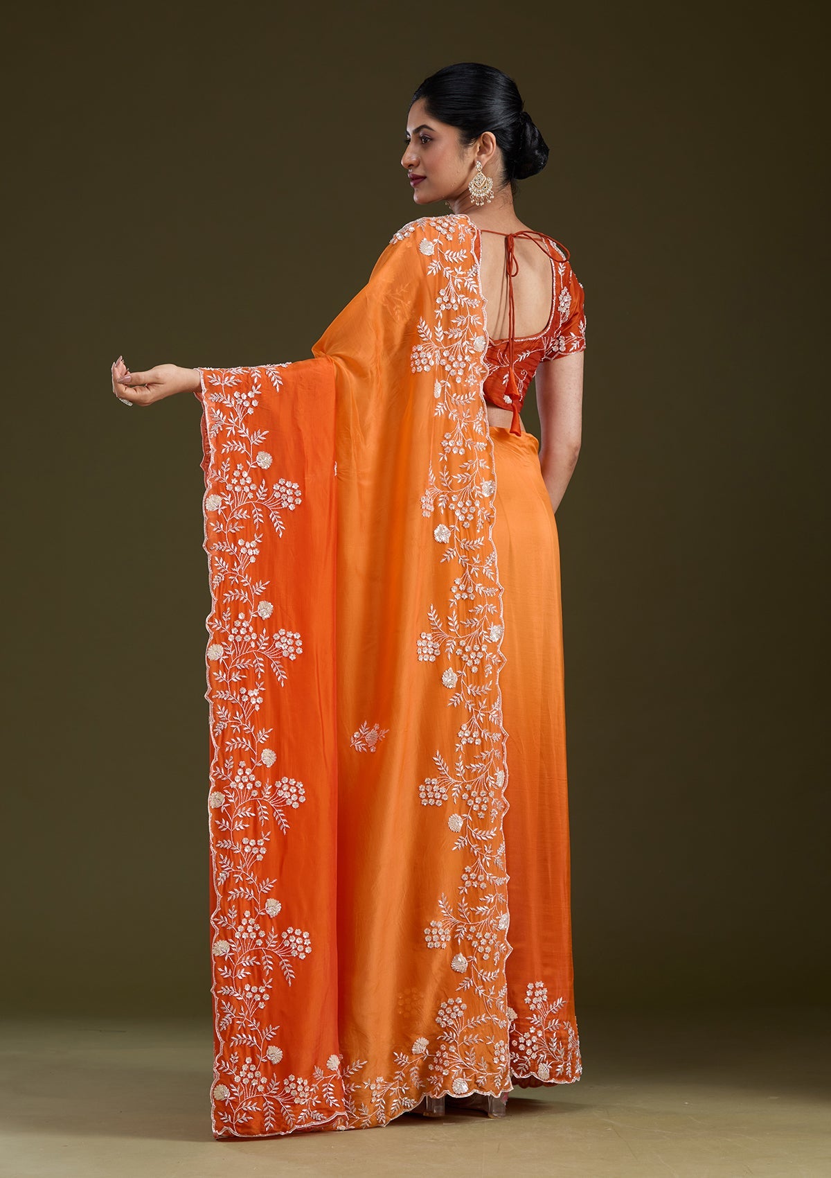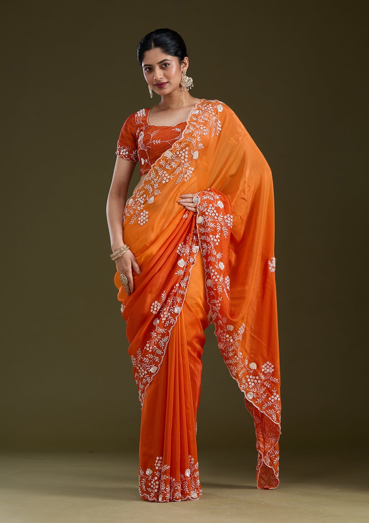 Orange Saree in Satin fabric. The Saree is elevated with Aariwork embroidery. It comes with an Unstitched blouse. Comes with the Koskii promise of premium quality.