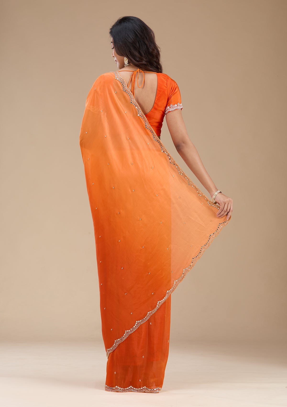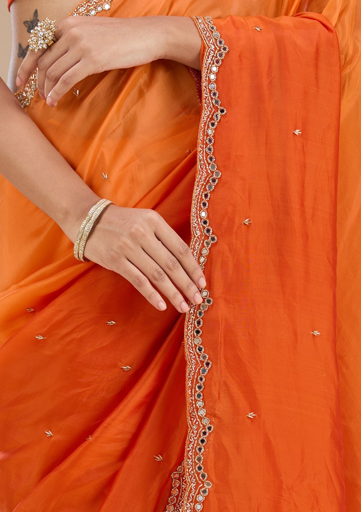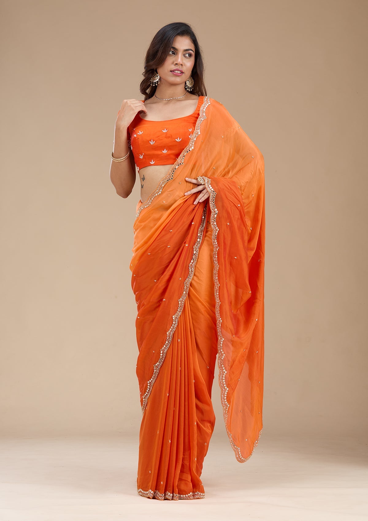 Orange Saree in Satin fabric. The Saree is elevated with Cutdana embroidery. It comes with an Unstitched blouse. Comes with the Koskii promise of premium quality.