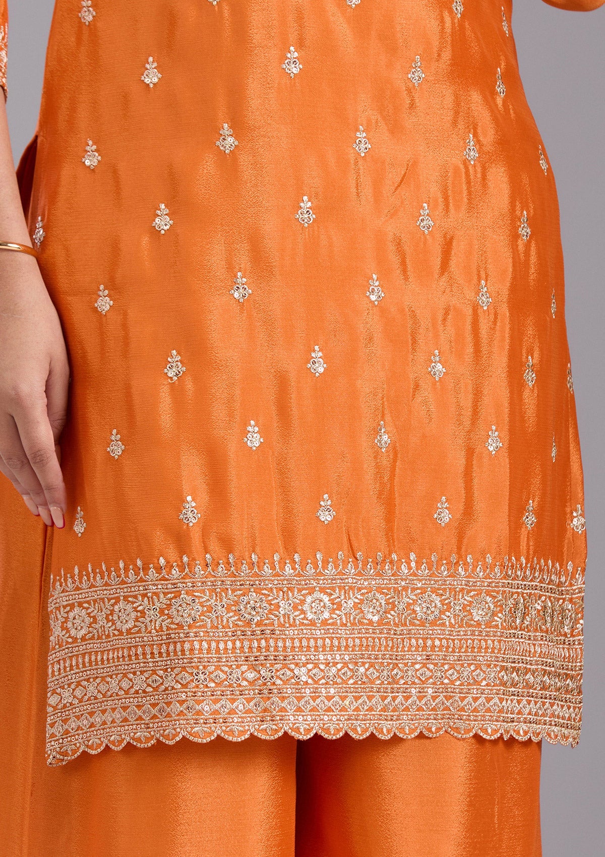 Orange Salwar Suit in Soft Raw Silk fabric The Salwar Suit is embellished with Sequins embroidery Accompanied with a bottom and dupatta Comes with the Koskii promise of premium quality.