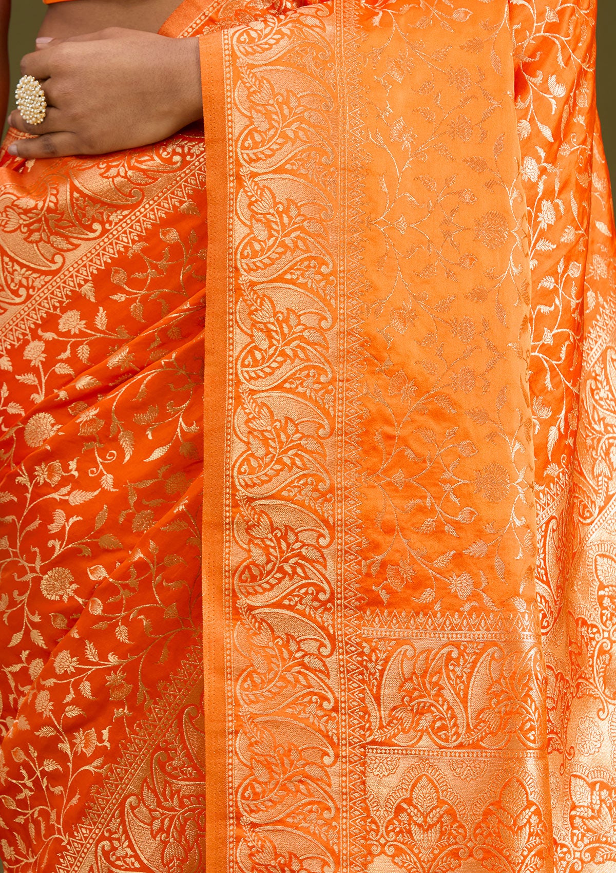 Orange Silk_Saree in Art Silk fabric. The Silk_Saree is elevated with Zariwork (Gold) embroidery. It comes with an Unstitched blouse. Comes with the Koskii promise of premium quality.