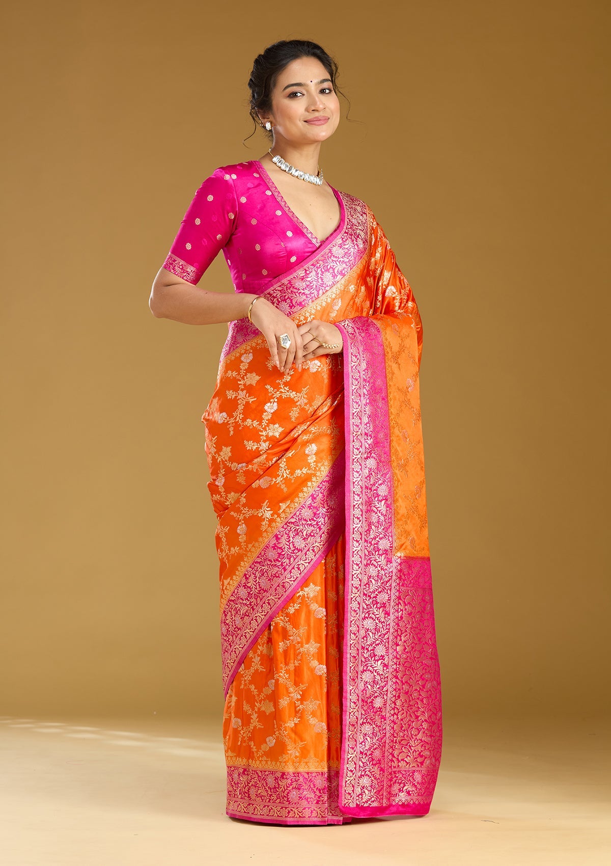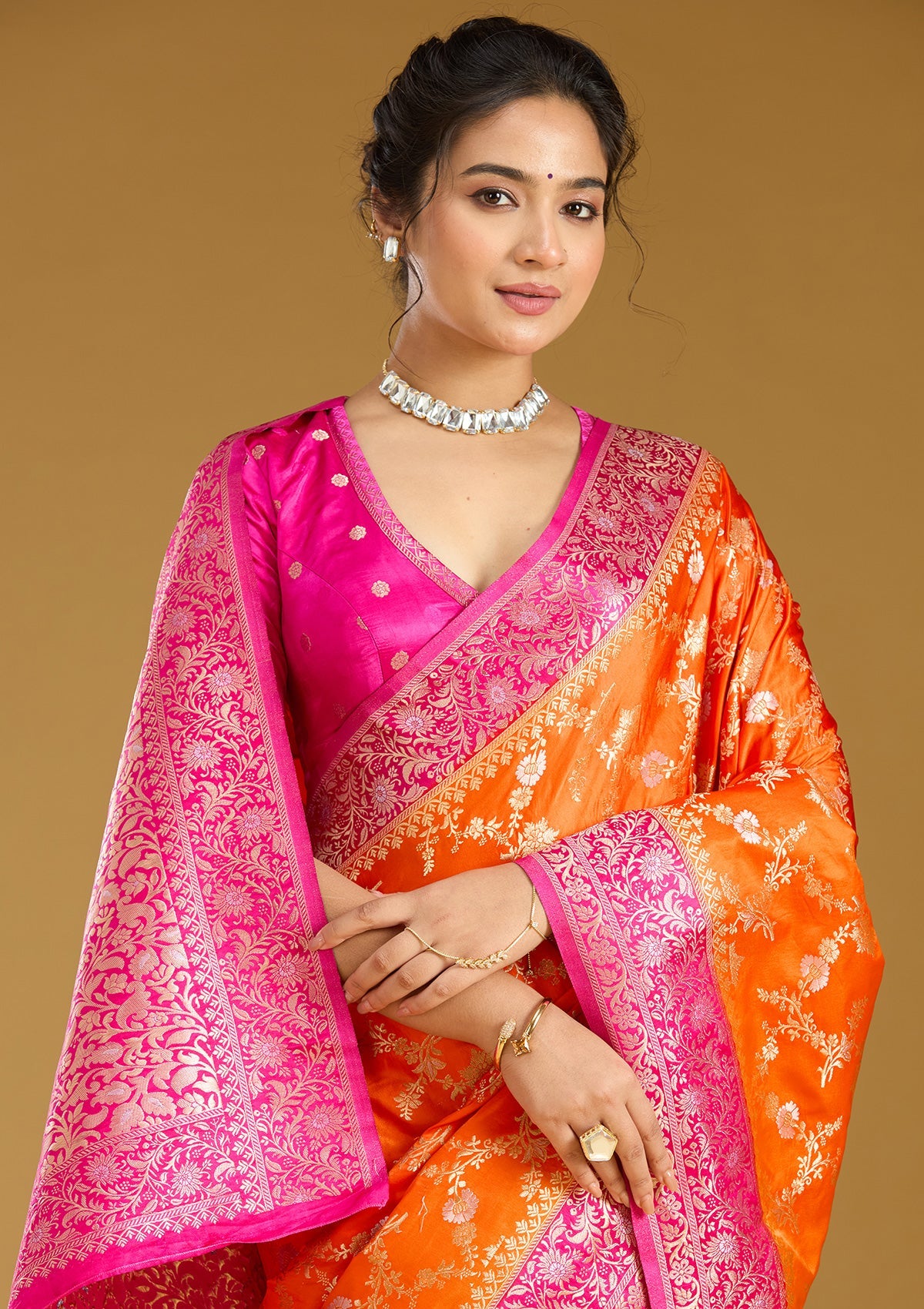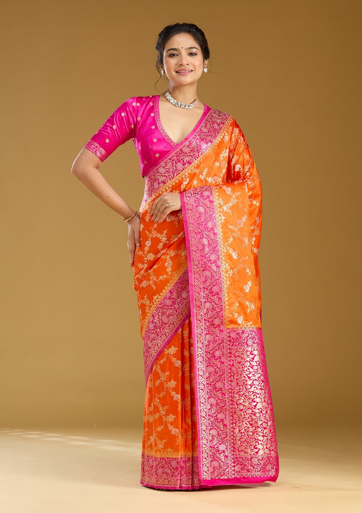 Orange Silk_Saree in Art Silk fabric. The Silk_Saree is elevated with Zariwork (Gold) embroidery. It comes with an Unstitched blouse. Comes with the Koskii promise of premium quality.
