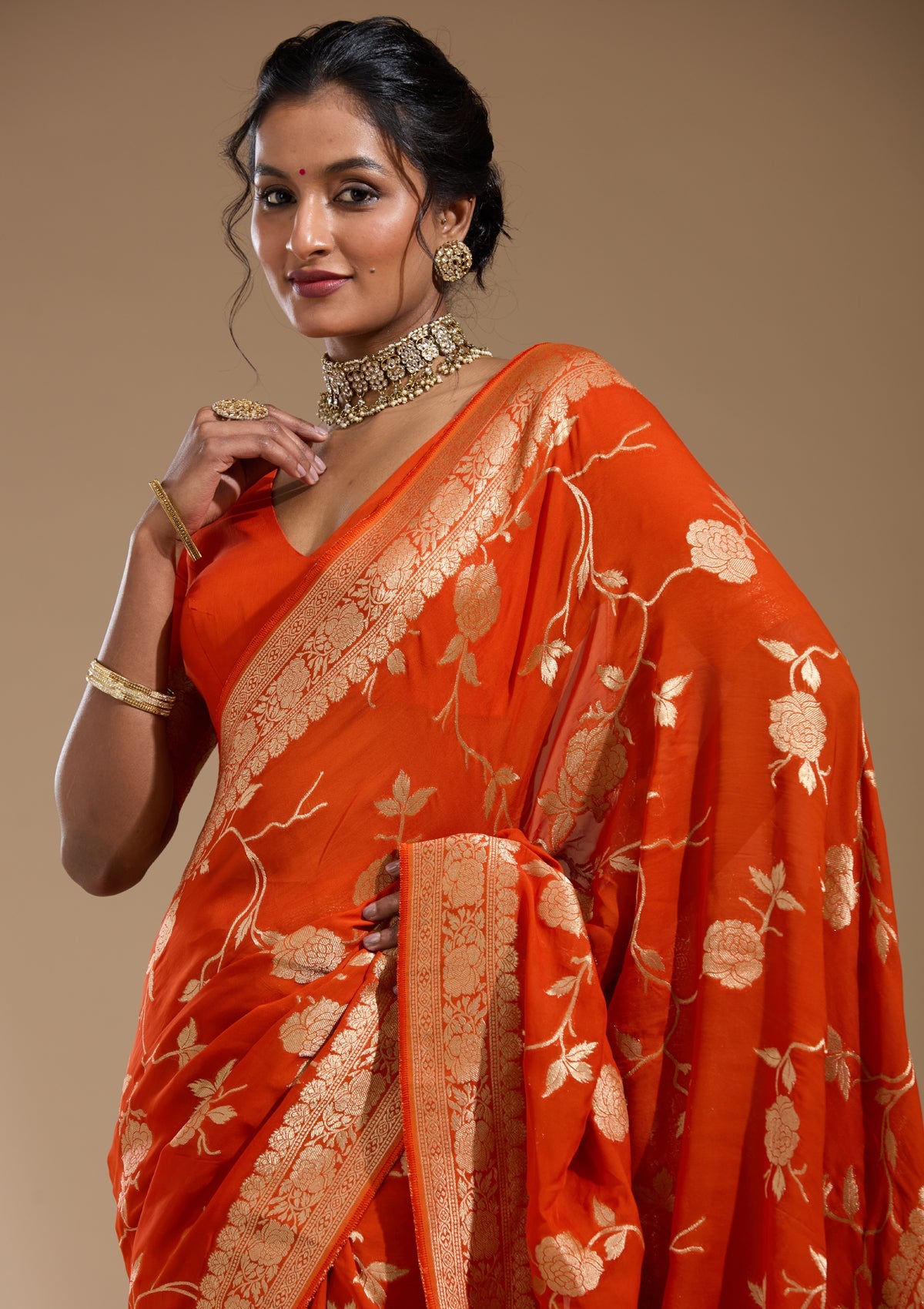 Orange Silk_Saree in Satin fabric. The Silk_Saree is elevated with Zariwork (Gold) embroidery. It comes with an Unstitched blouse. Comes with the Koskii promise of premium quality.