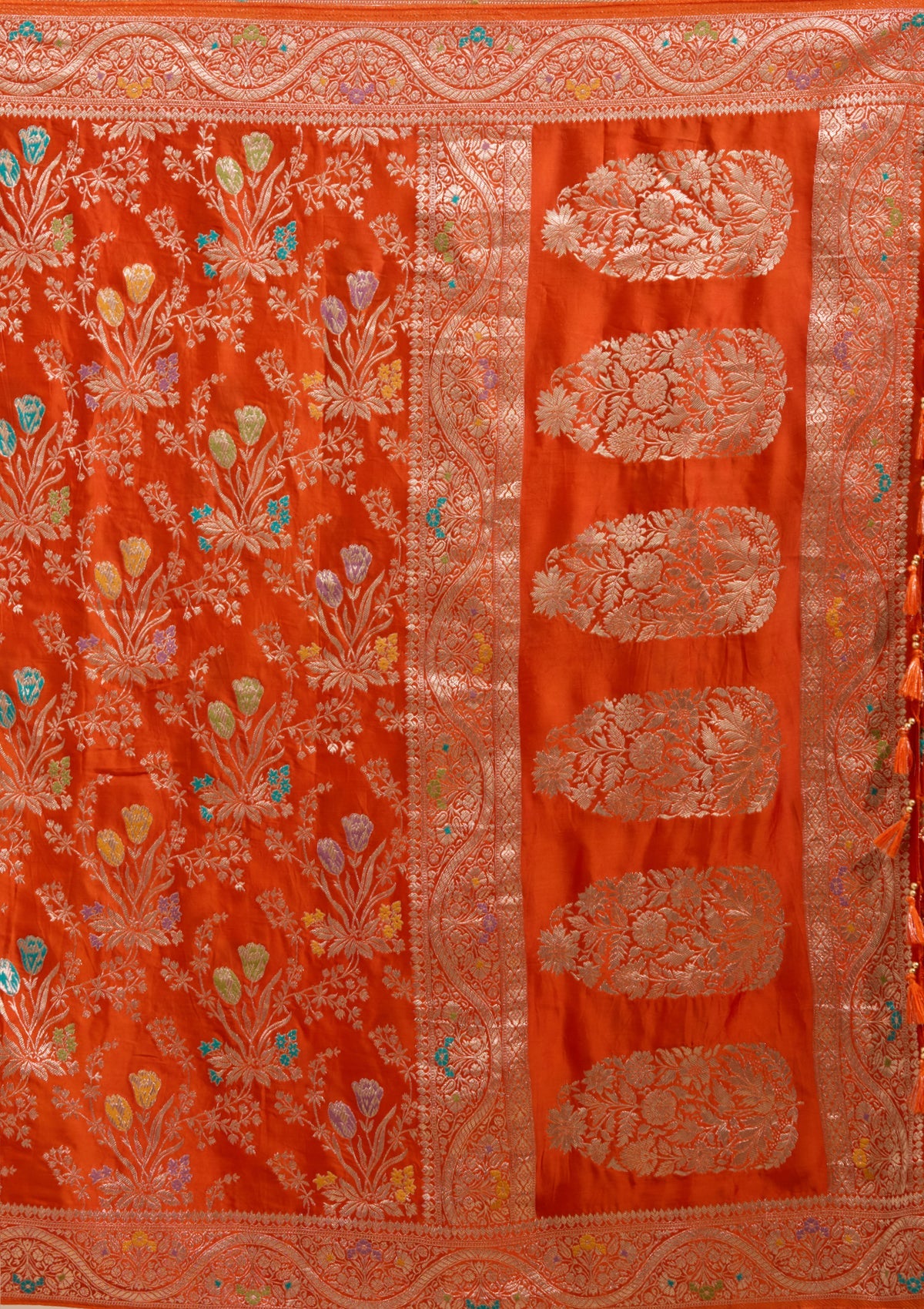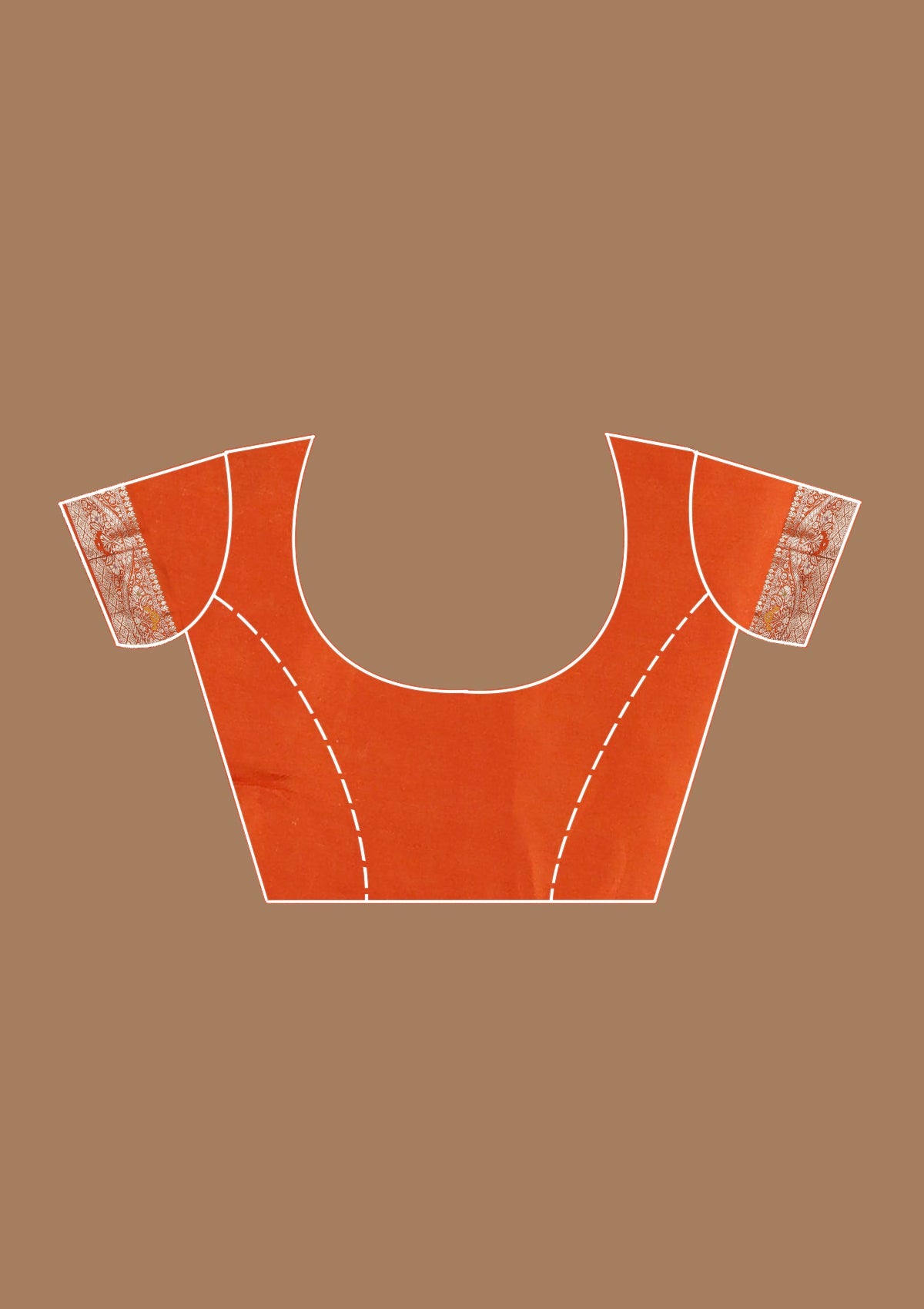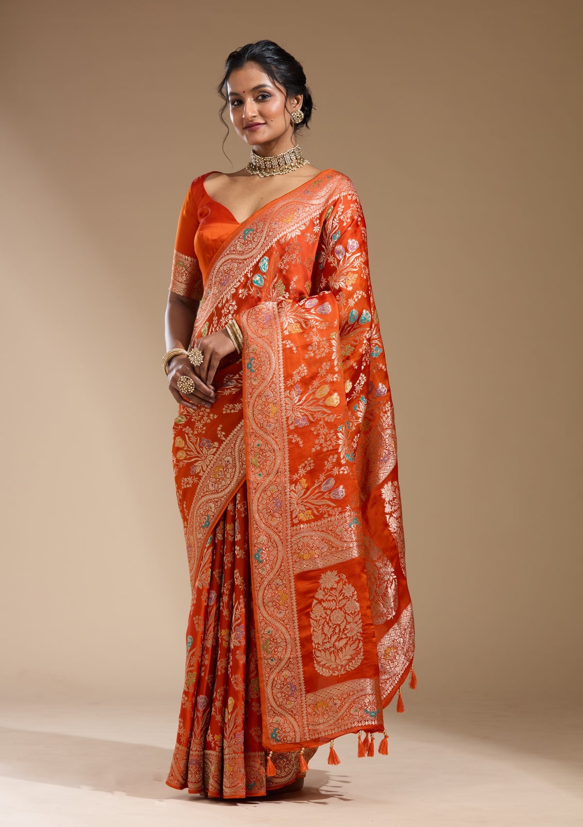 Orange Silk_Saree in Satin fabric. The Silk_Saree is elevated with Zariwork (Gold) embroidery. It comes with an Unstitched blouse. Comes with the Koskii promise of premium quality.