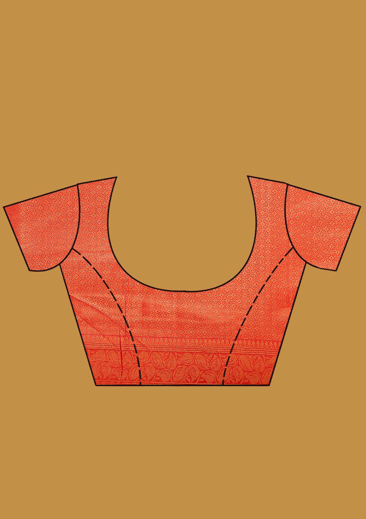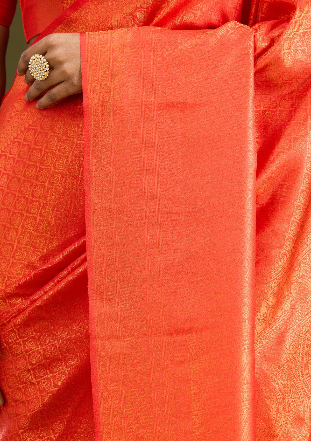Orange Silk_Saree in Silk fabric. The Silk_Saree is elevated with Zariwork (Gold) embroidery. It comes with an Unstitched blouse. Comes with the Koskii promise of premium quality.