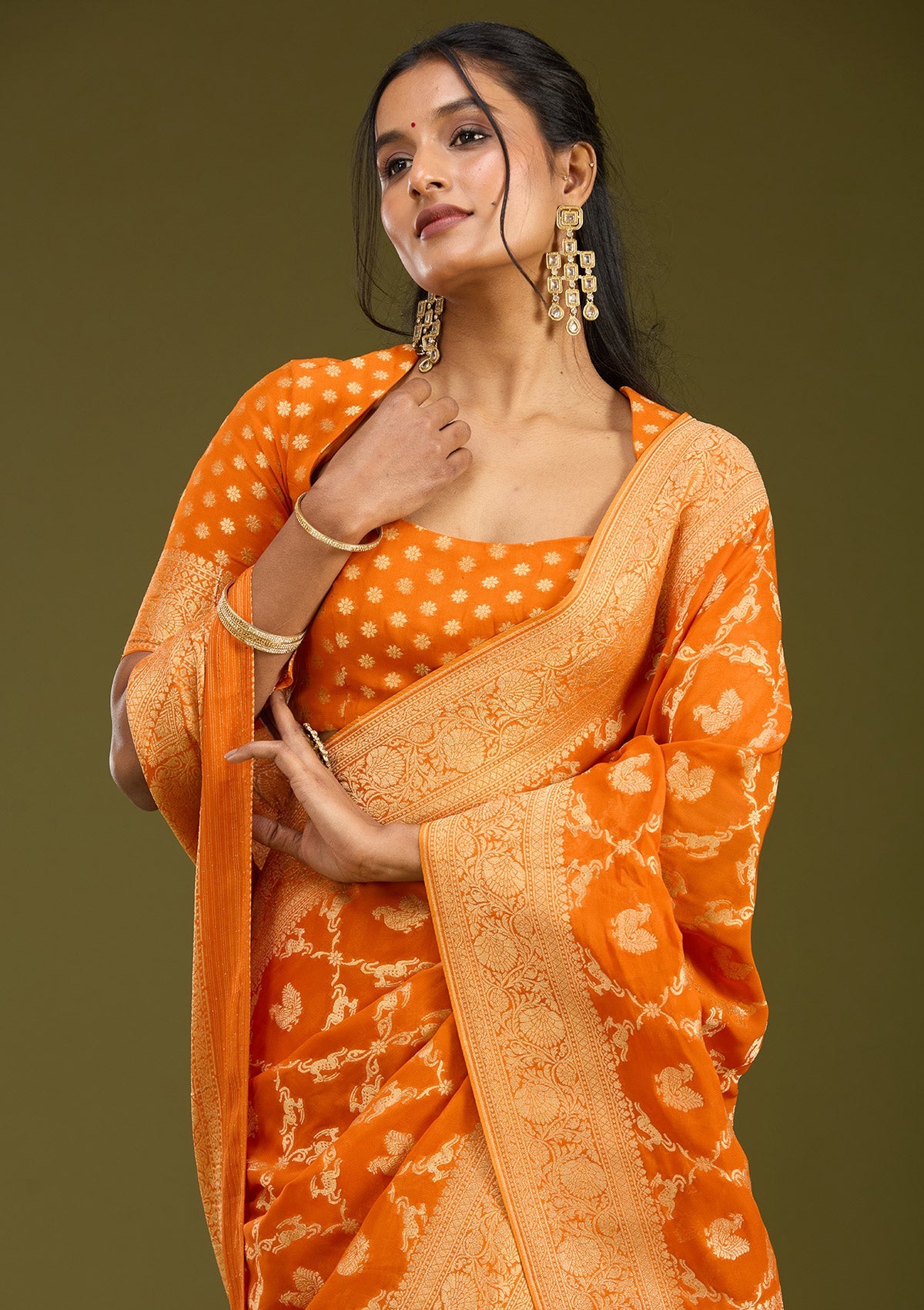 Orange Silk_Saree in Satin fabric. The Silk_Saree is elevated with Zariwork embroidery. It comes with an Unstitched blouse. Comes with the Koskii promise of premium quality.