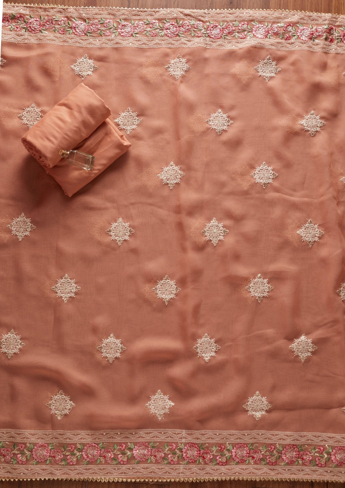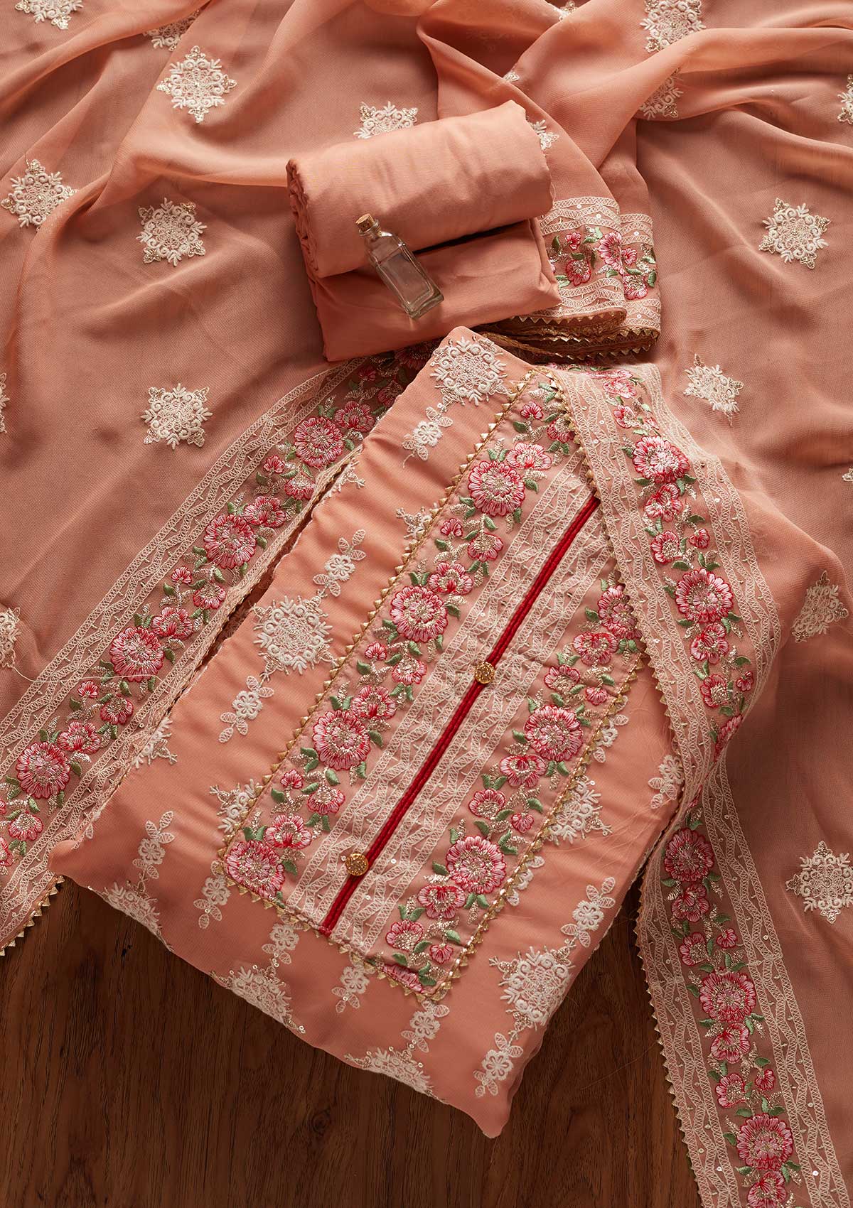 Peach Salwar Suit In Georgette Fabric. The Salwar Suit Is Embellished With Chikankari Embroidery. Accompanied with an unstitched bottom and dupatta. Comes With The Koskii Promise Of Premium Quality.