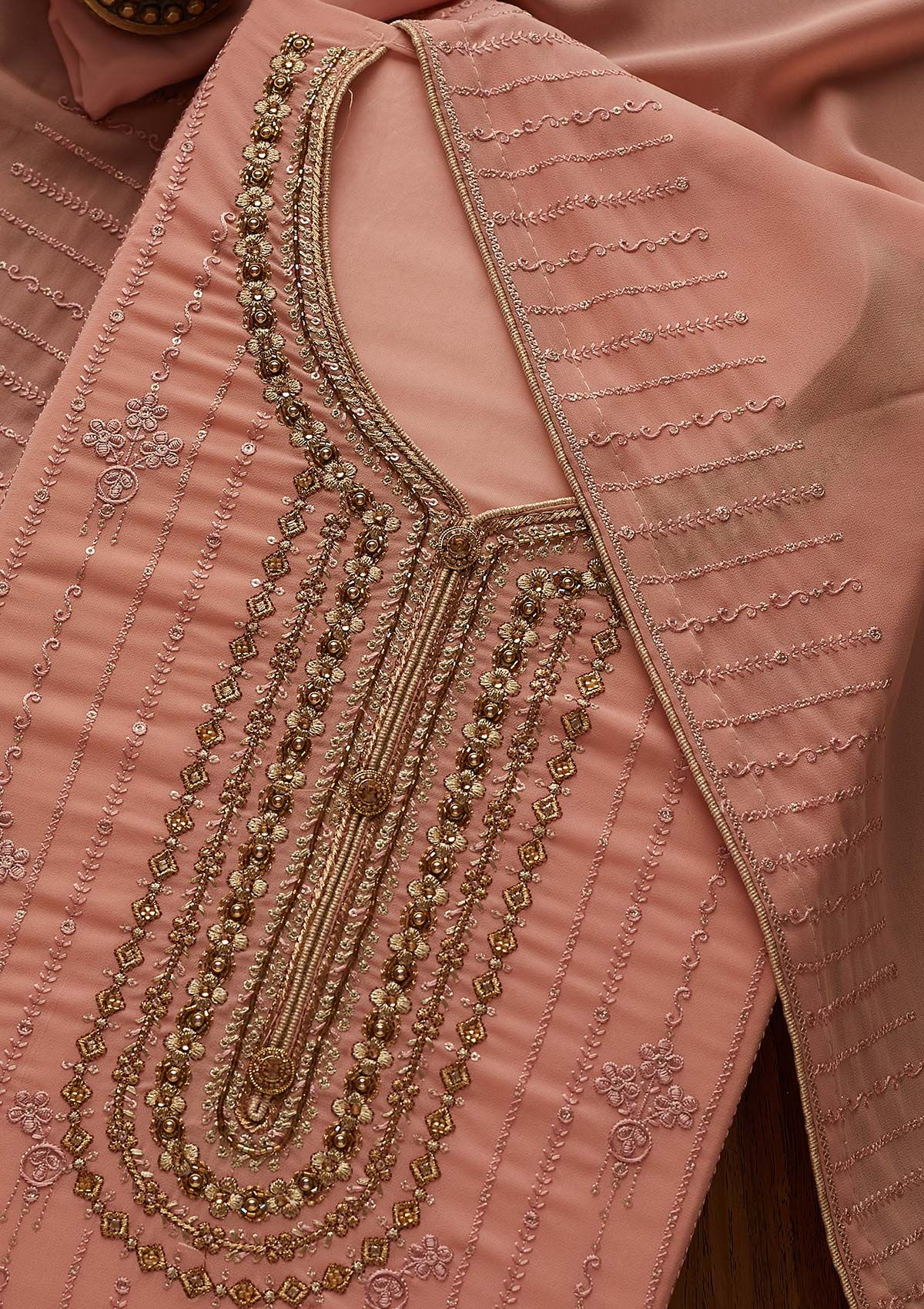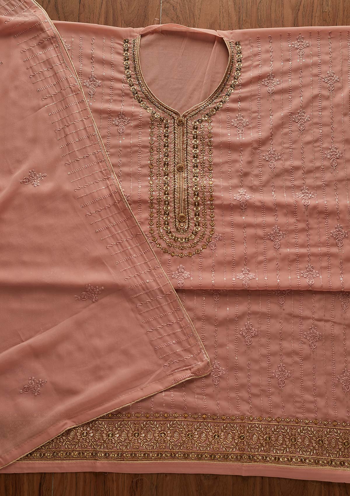 Peach Salwar Suit In Georgette Fabric. The Salwar Suit Is Embellished With Cutdana Embroidery. Accompanied with an unstitched bottom and dupatta. Comes With The Koskii Promise Of Premium Quality.