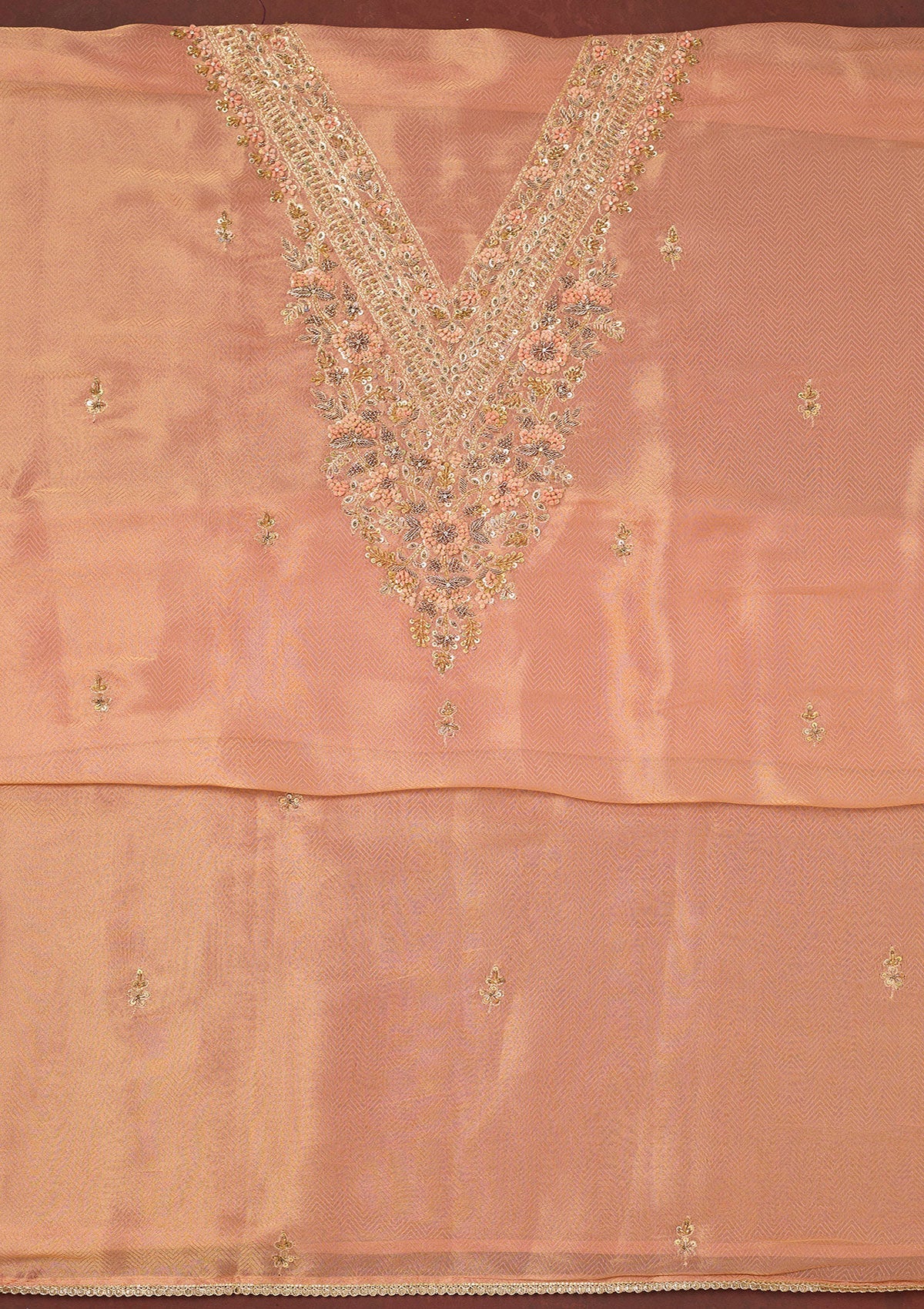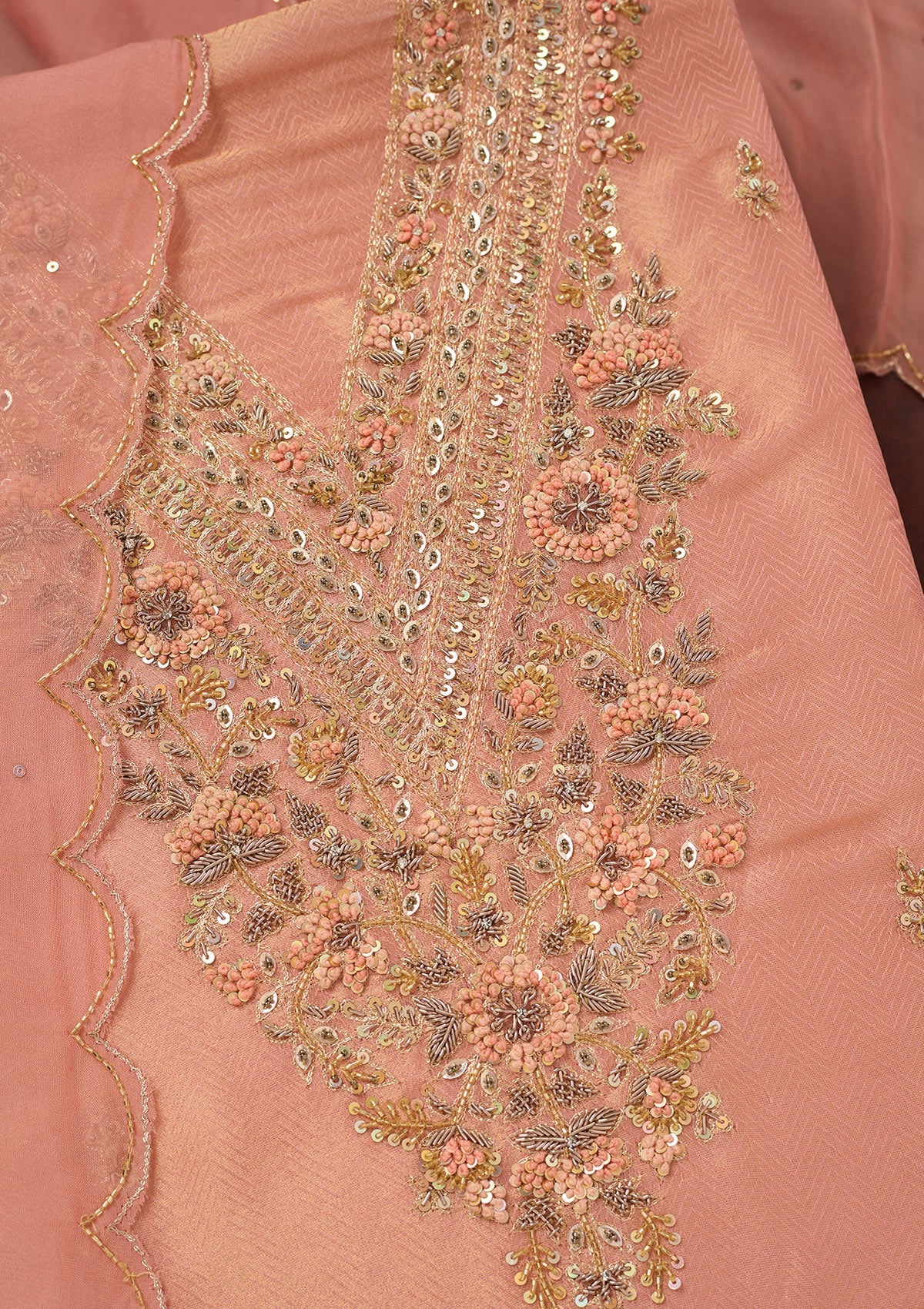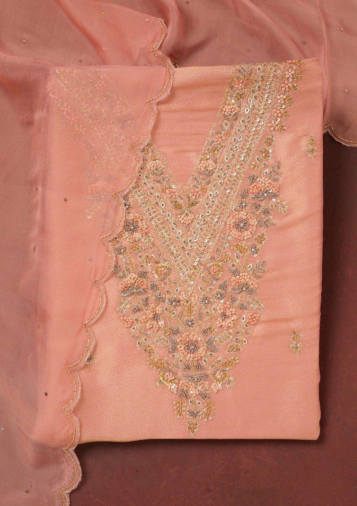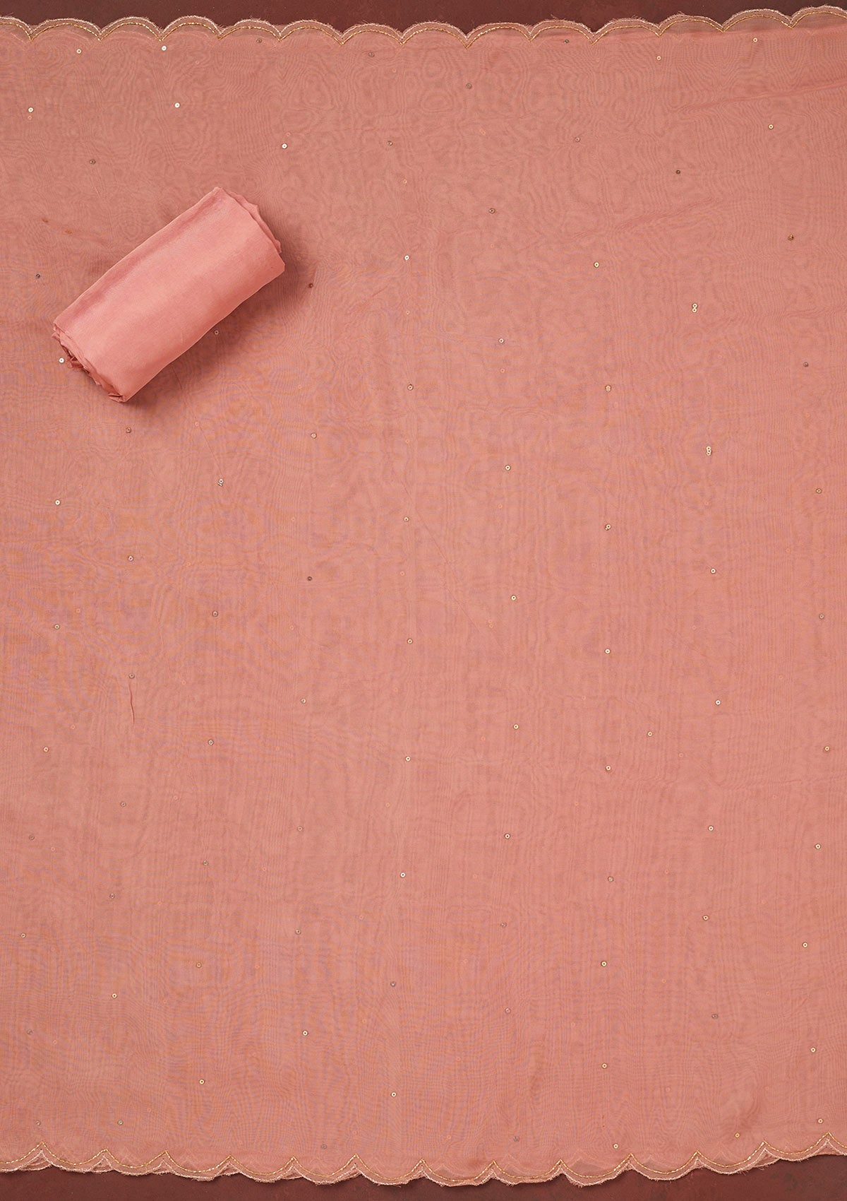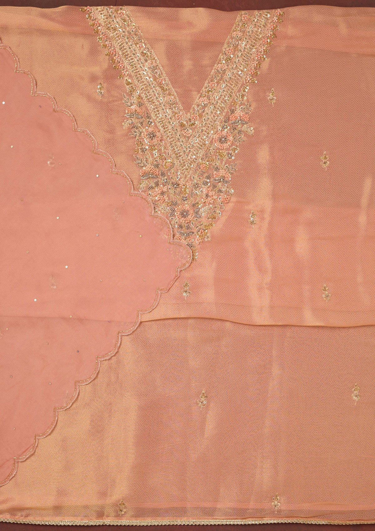 Peach Salwar Suit in Organza fabric The Salwar Suit is embellished with Cutdana embroidery Accompanied with a bottom and dupatta Comes with the Koskii promise of premium quality.