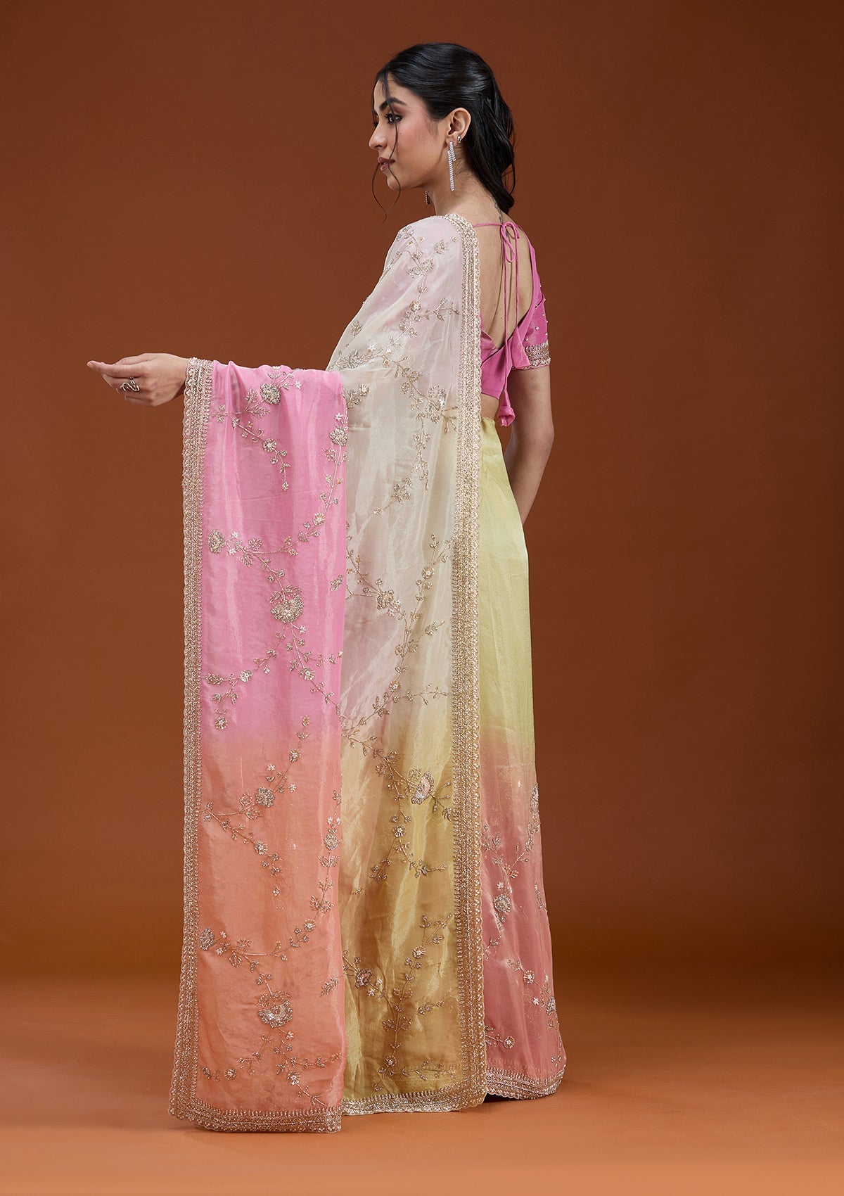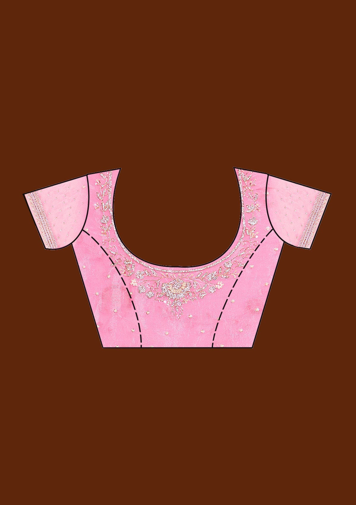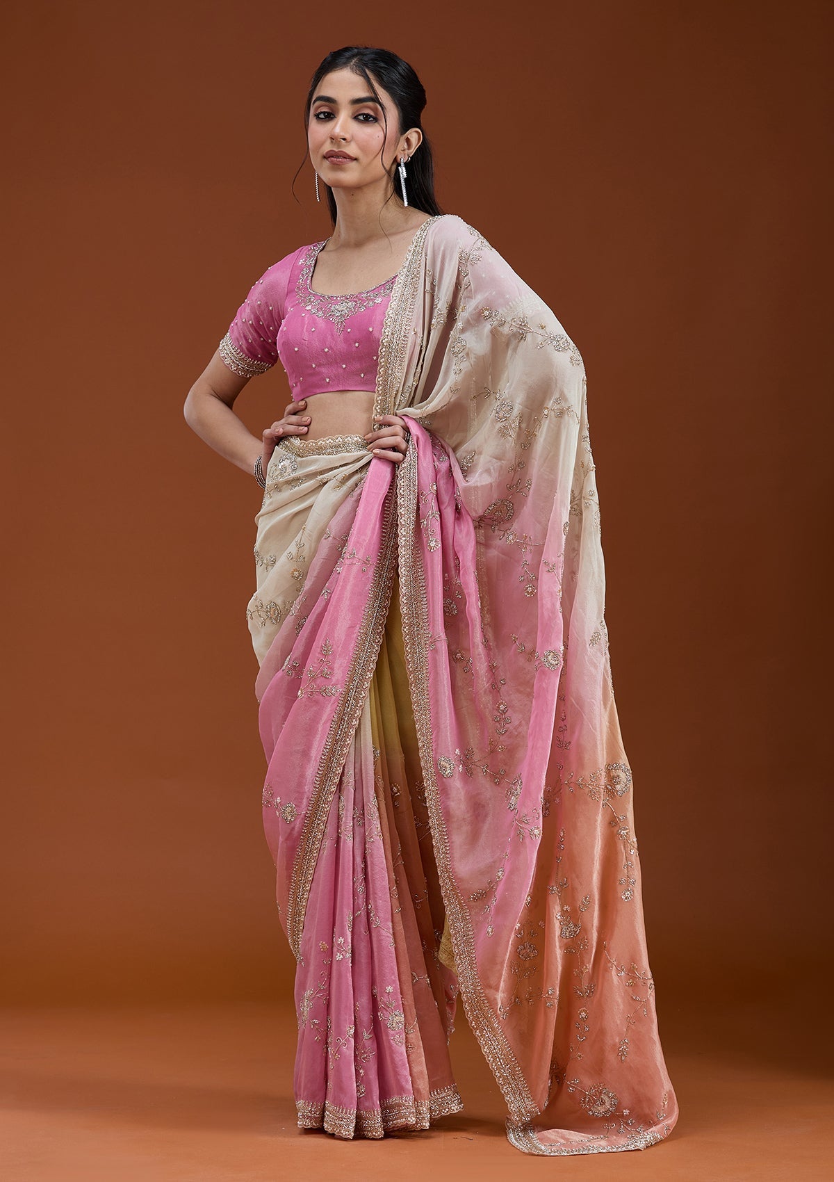 Peach Saree in Tissue fabric. The Saree is elevated with Cutdana embroidery. It comes with an Unstitched blouse. Comes with the Koskii promise of premium quality.