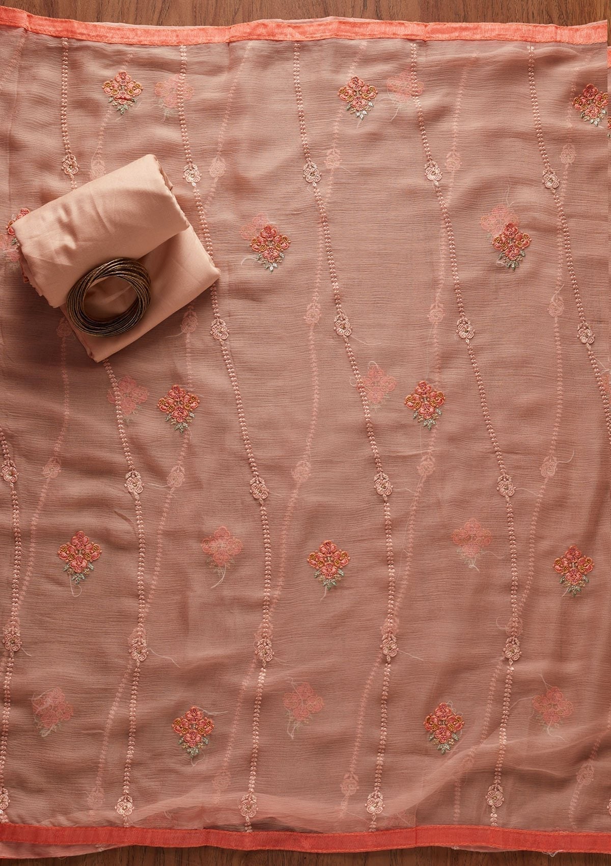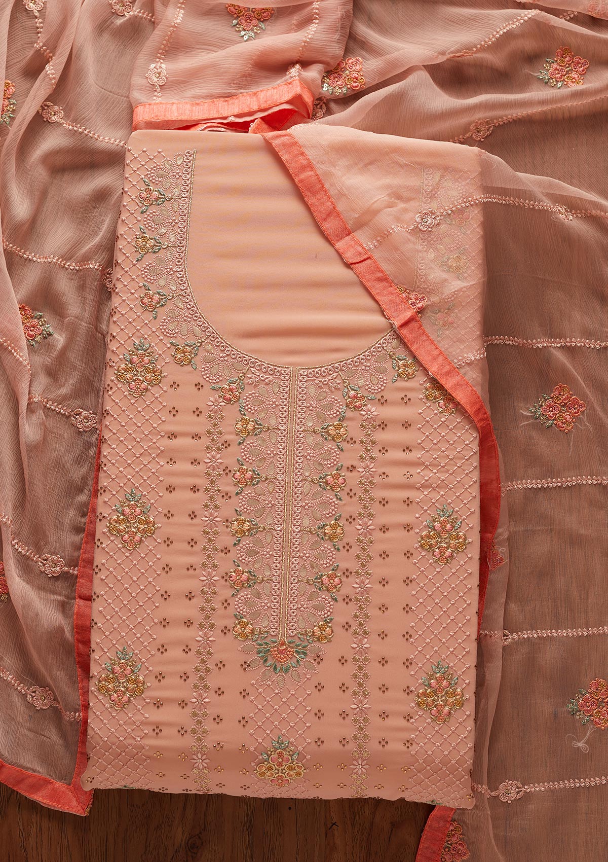 Peach Salwar Suit In Georgette Fabric. The Salwar Suit Is Embellished With Gotapatti Embroidery. Accompanied with an unstitched bottom and dupatta. Comes With The Koskii Promise Of Premium Quality.