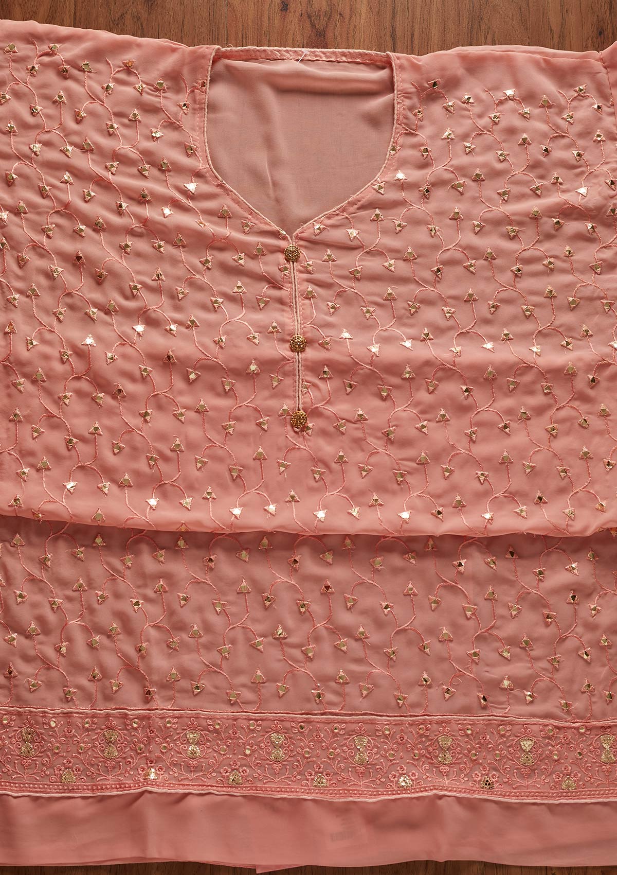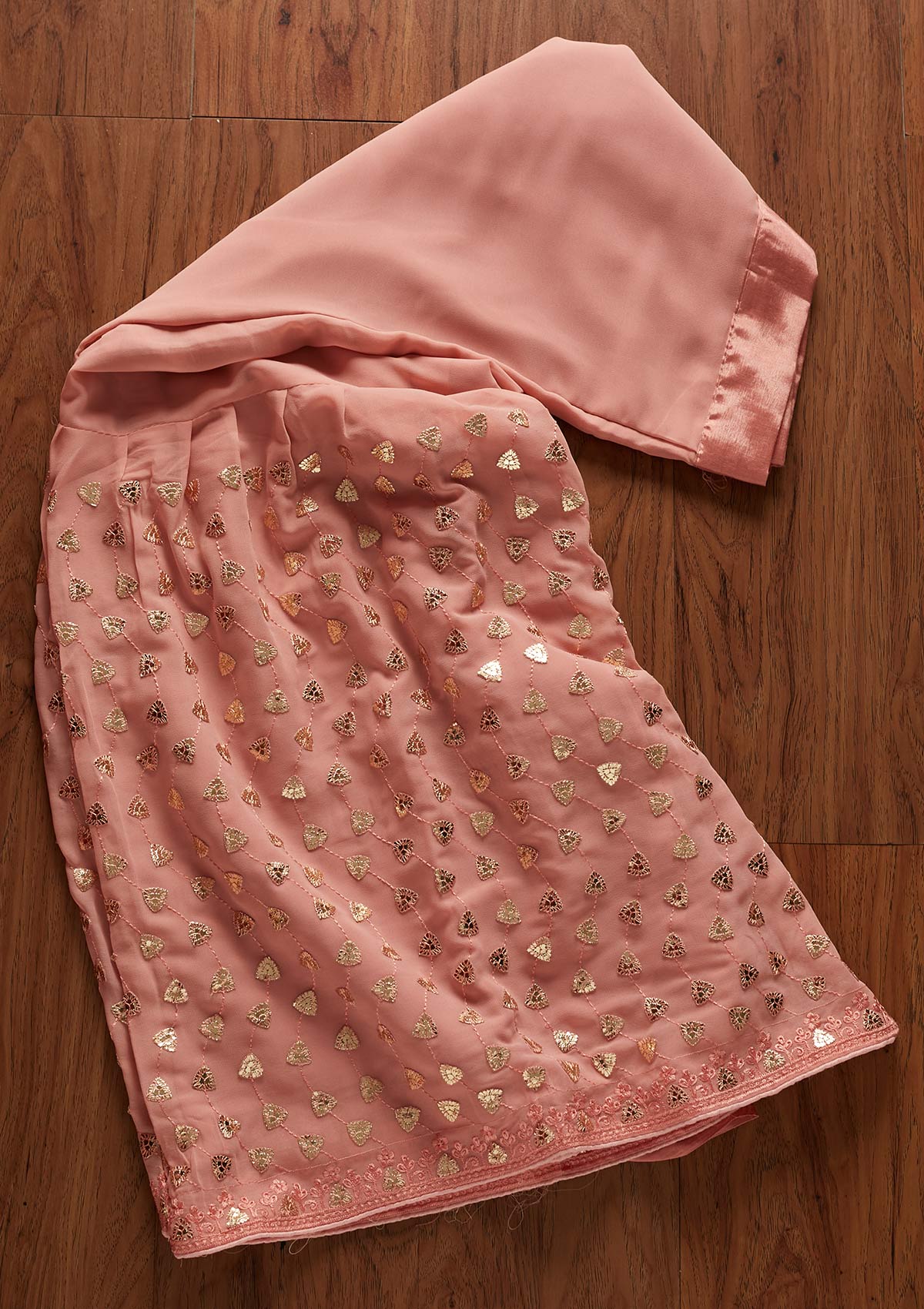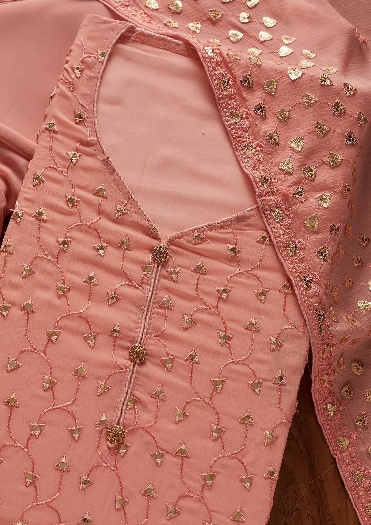 Peach Salwar Suit In Georgette Fabric. The Salwar Suit Is Embellished With Gotapatti Embroidery. Accompanied with an unstitched bottom and dupatta. Comes With The Koskii Promise Of Premium Quality.