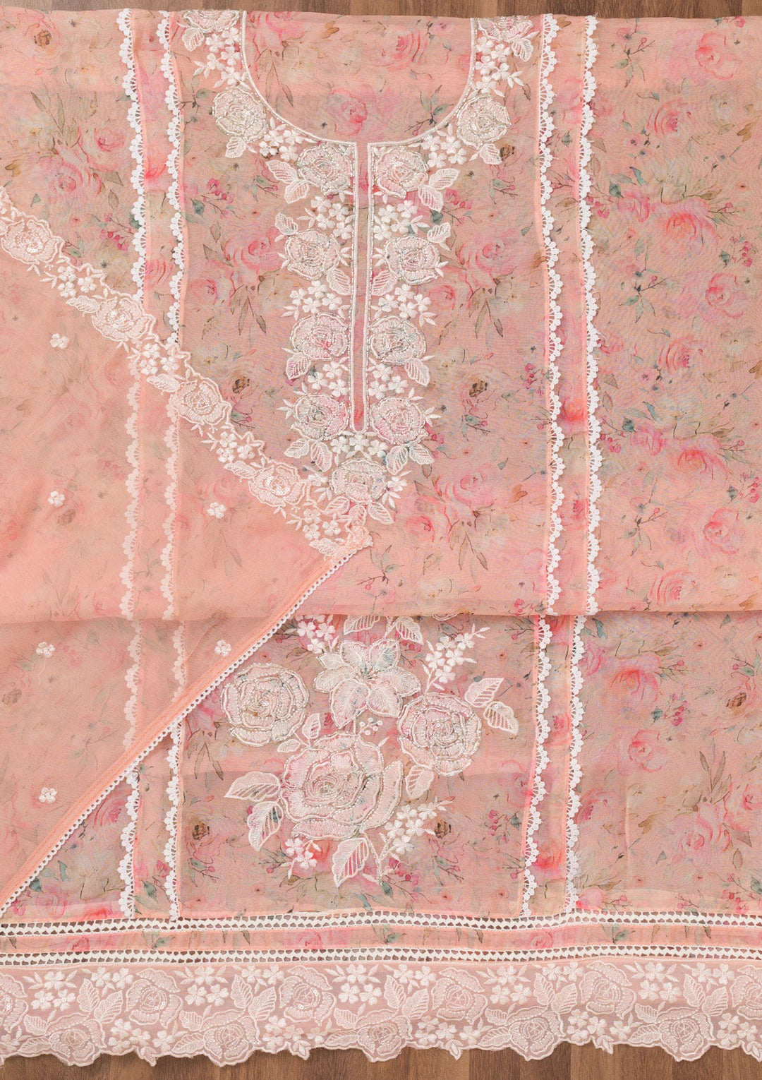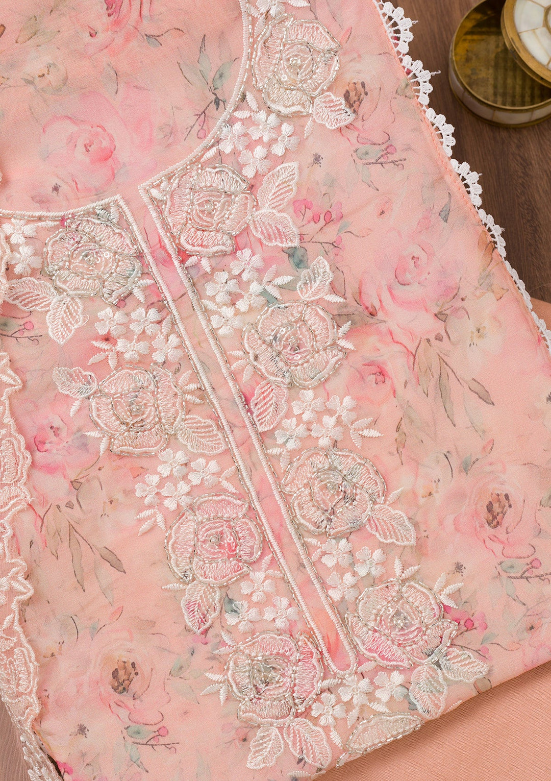 Peach Salwar Suit in Organza fabric. The Salwar Suit is embellished with Printed embroidery. Accompanied with a bottom and dupatta. Comes with the Koskii promise of premium quality.